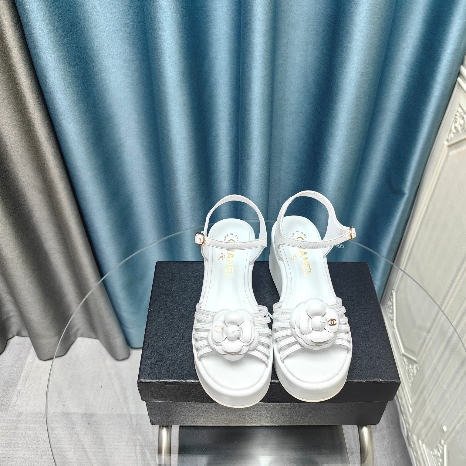 Camellia Slide Wedge Sandal White Lambskin