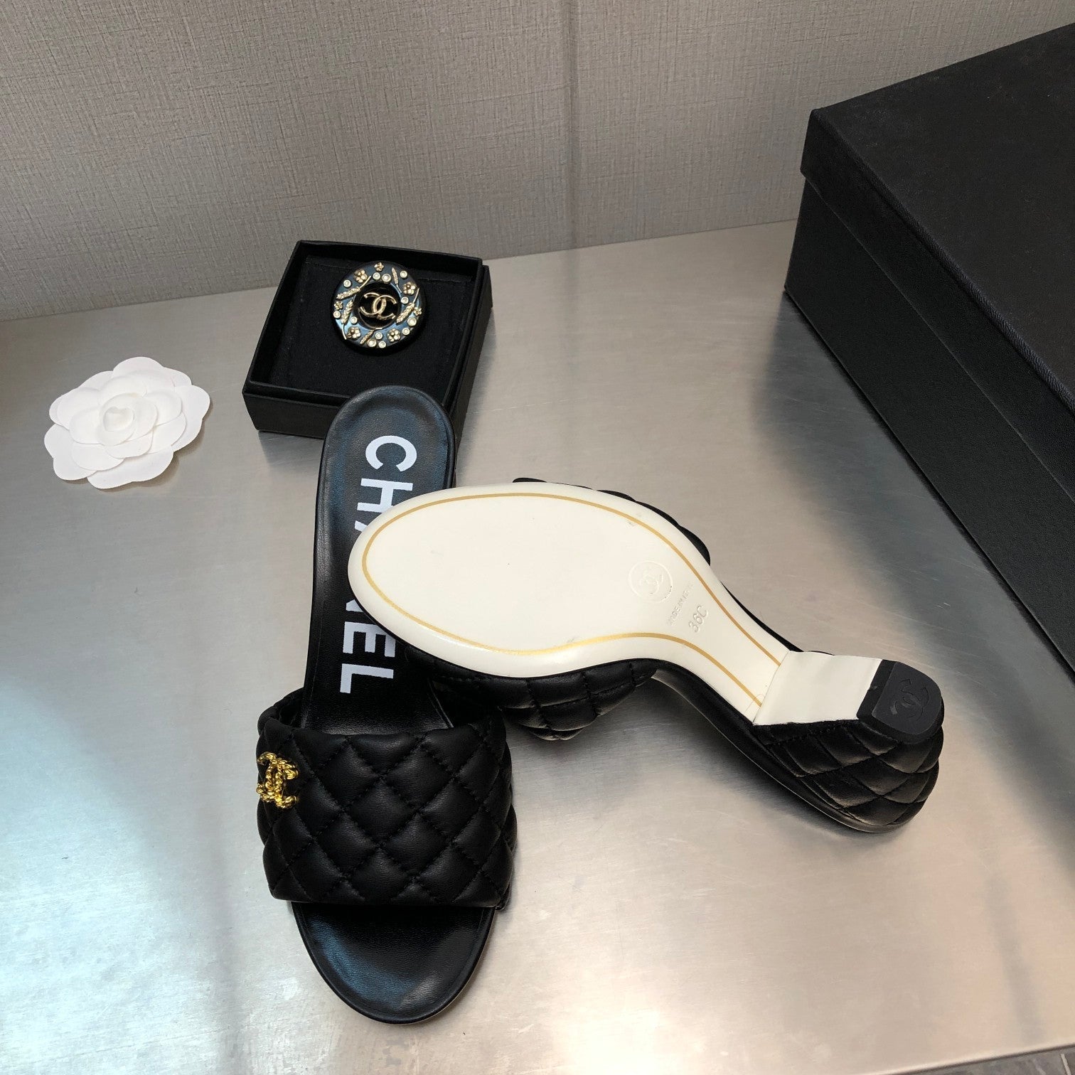 cc rev cone heel mule slide sandal black quilted lambskin 6cm