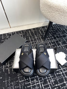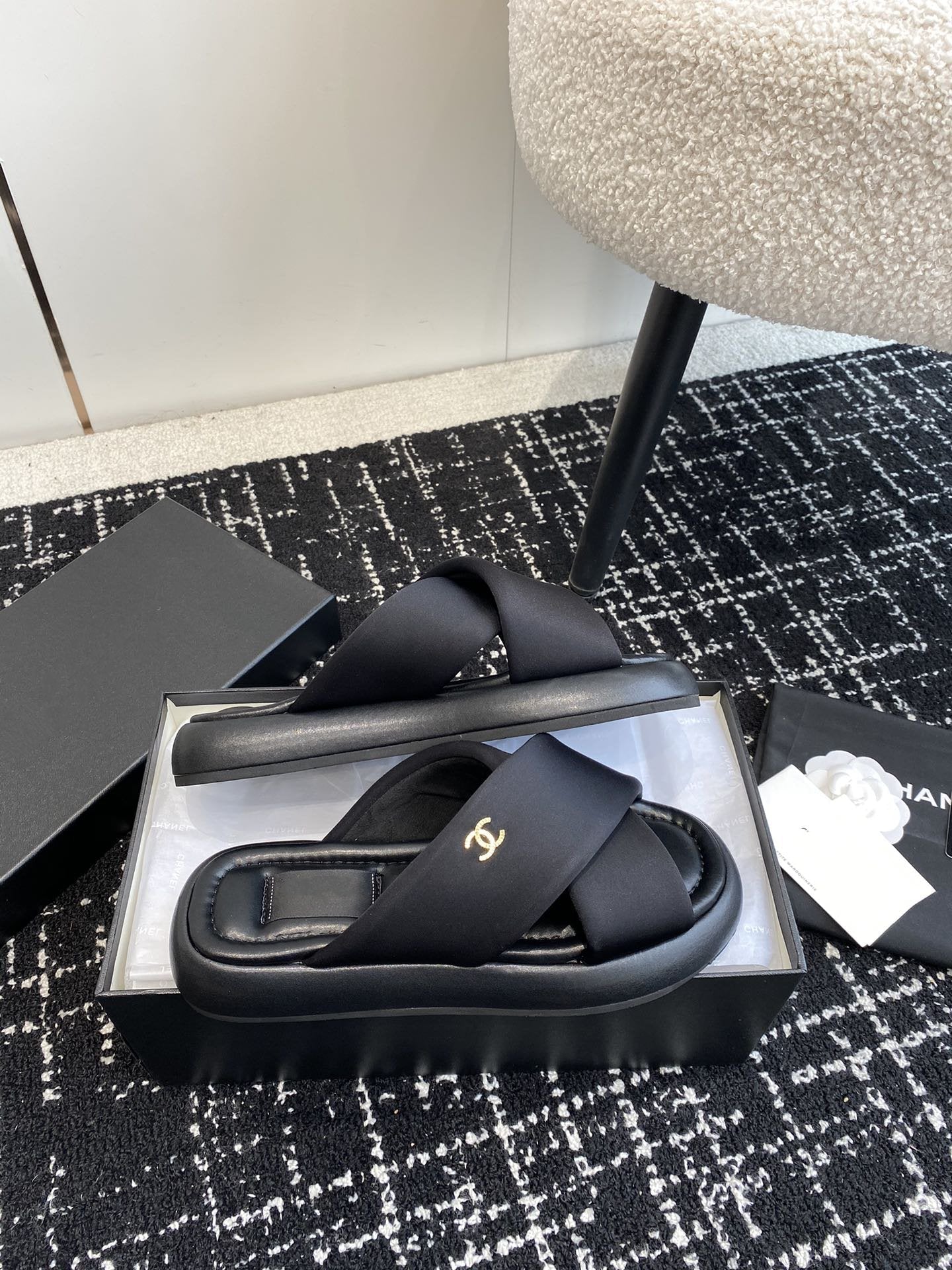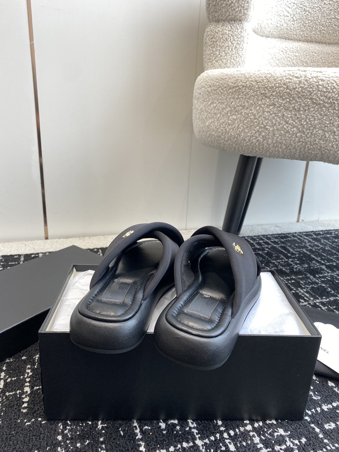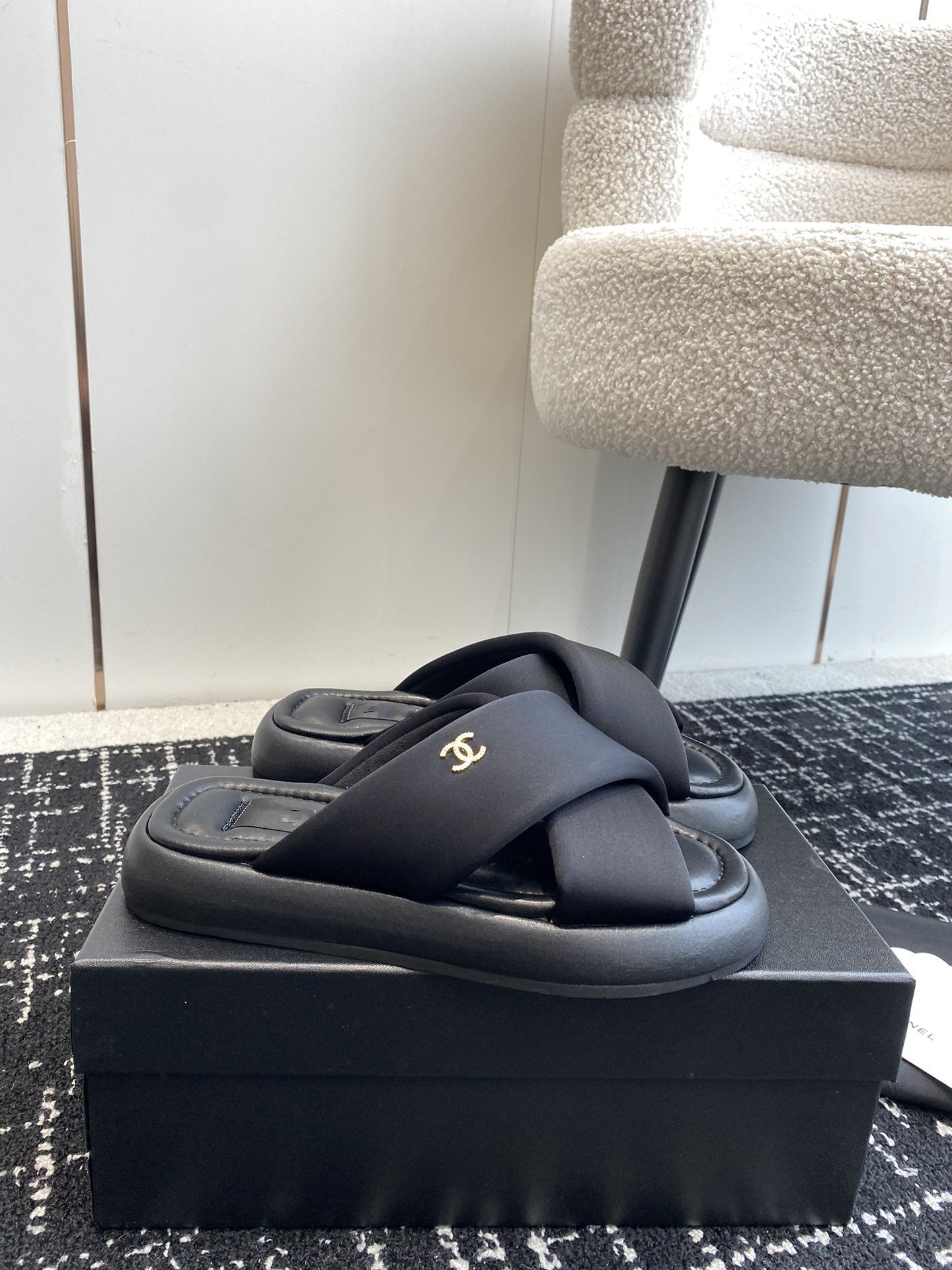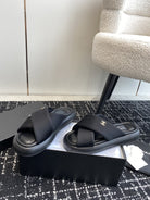 cross puffy slipper black lycra fabric