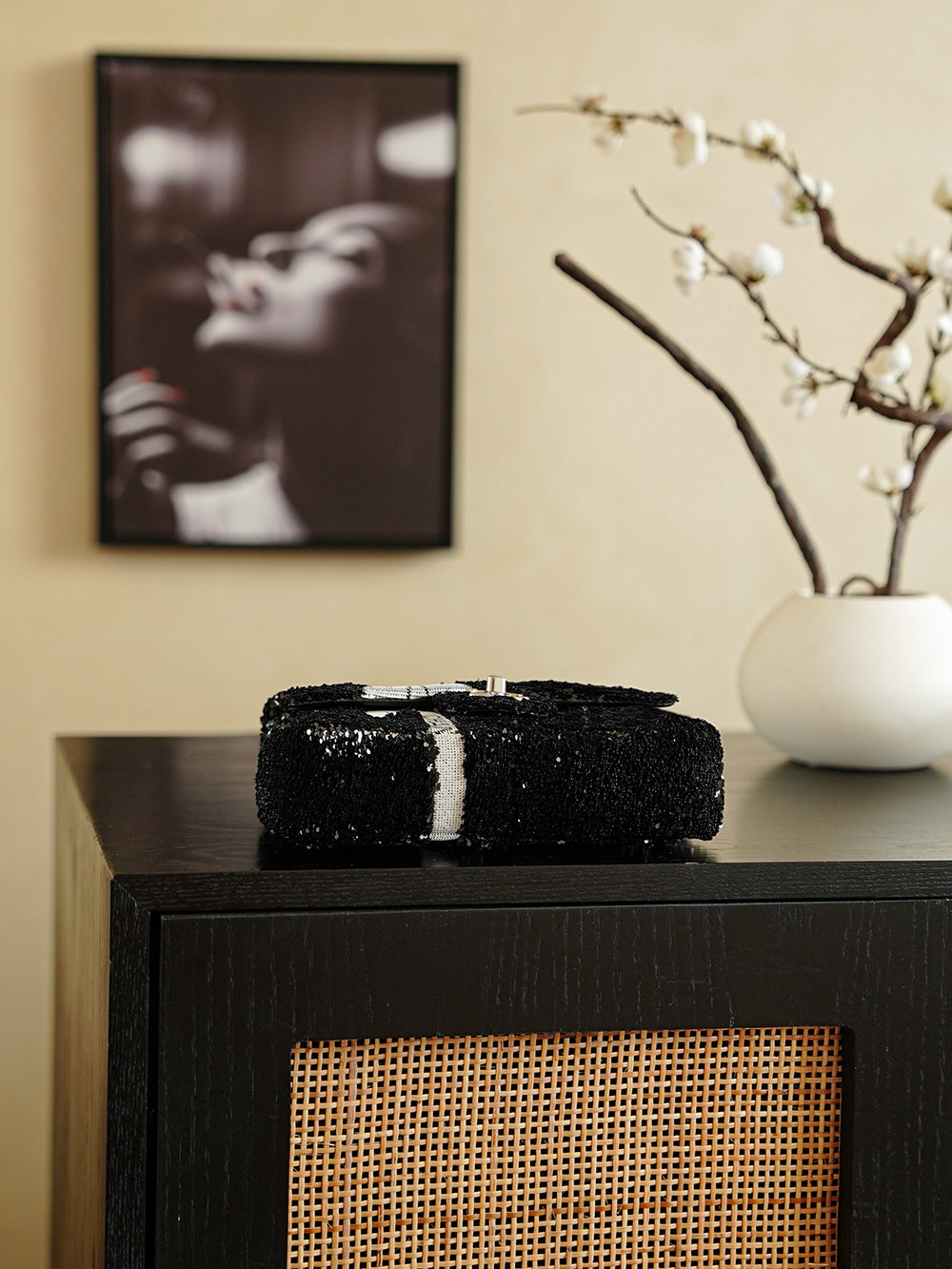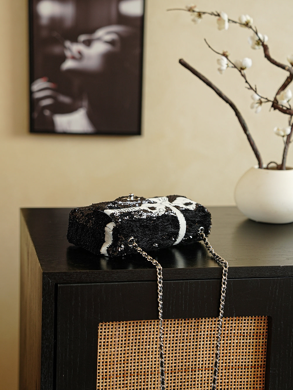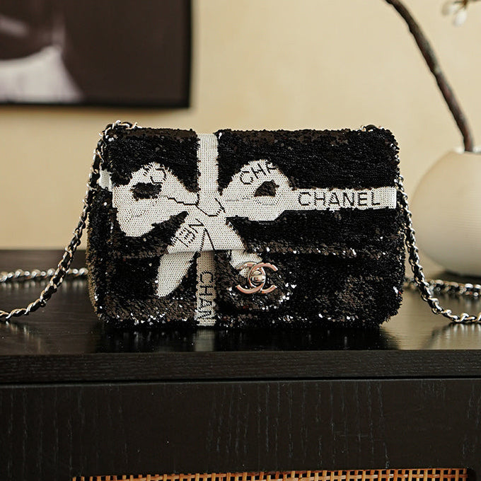 CC 2025 Bow Flap Bag Black White Sequin 308597
