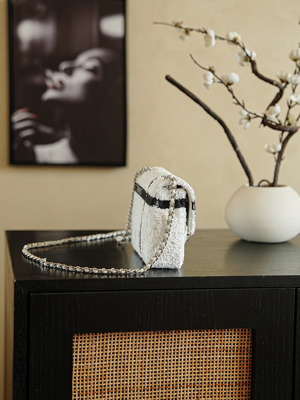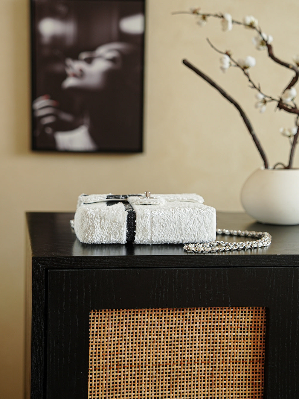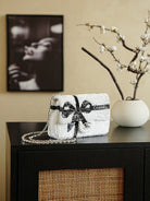 CC 2025 Bow Flap Bag White Black Sequin 308598