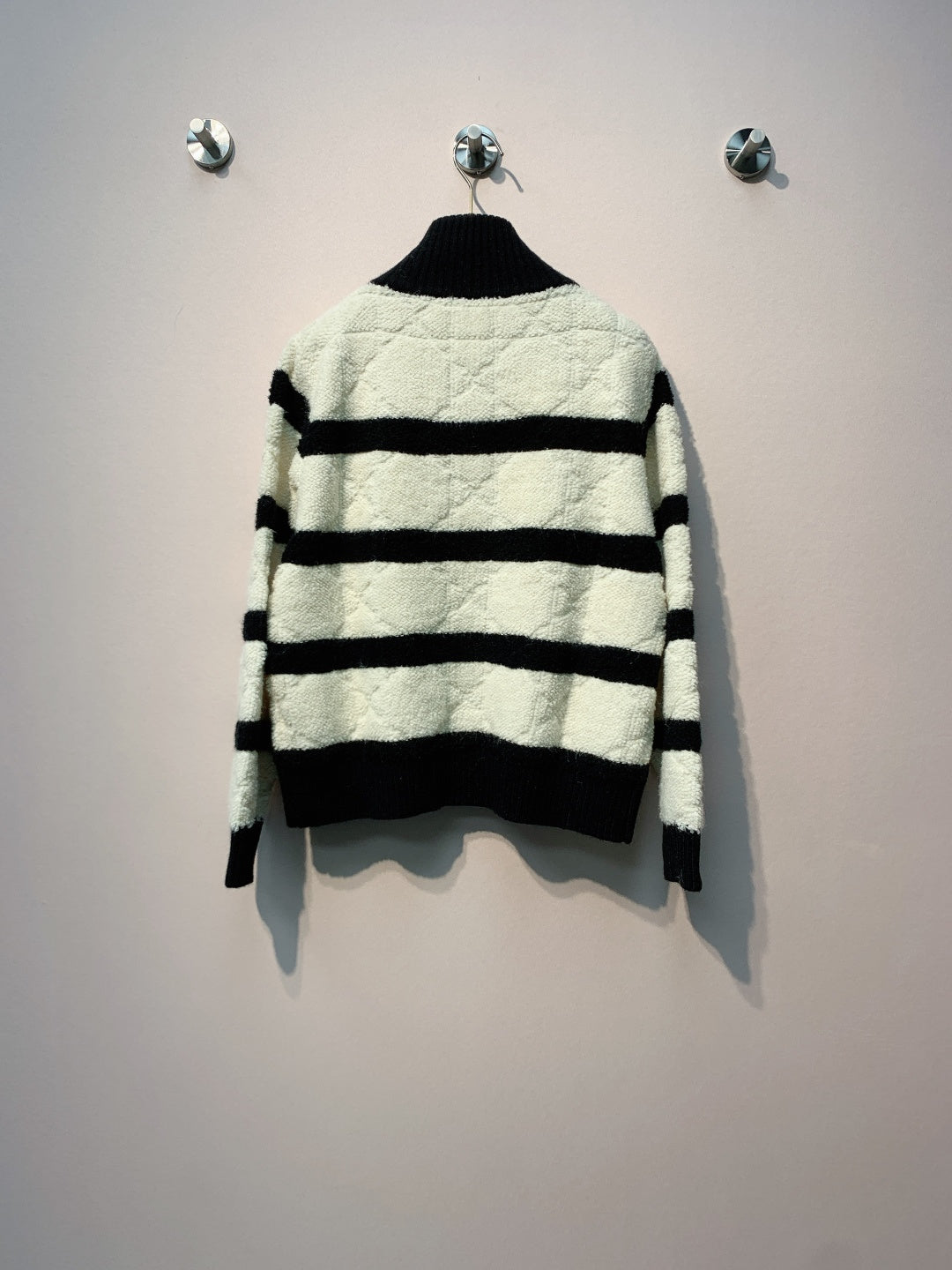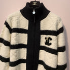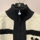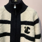 Chanel 25 Stand Collar Striped Knit Zipper Cardigan Black and White Wool 317967