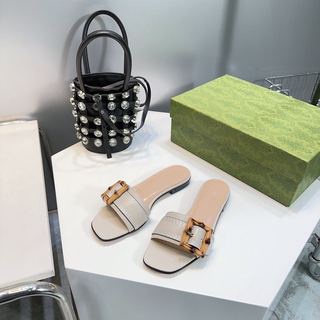 GG BAMBOO BUCKLE FLAT SANDALS WHITE