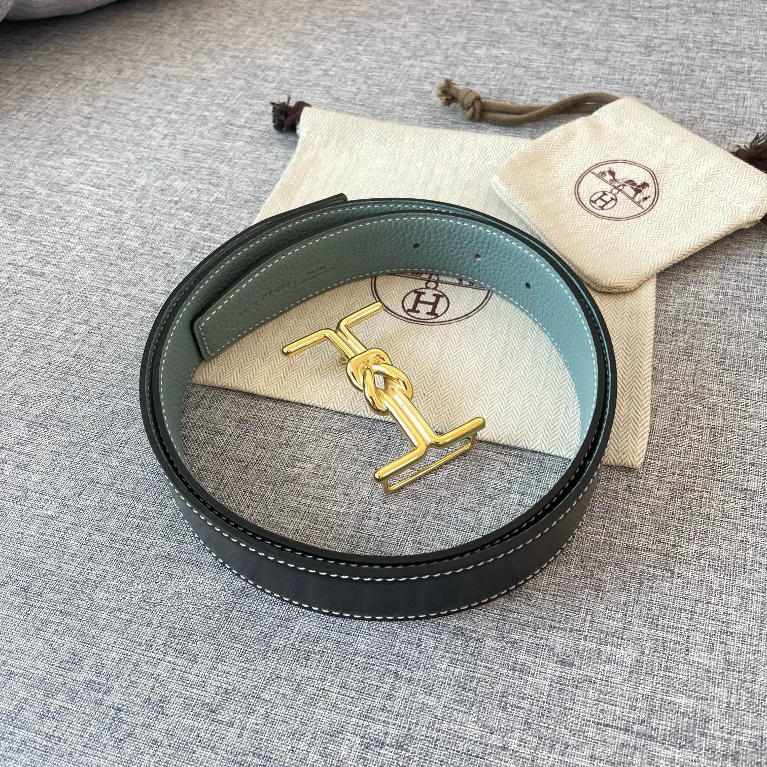 H MARIN REVERSIBLE BELT 32MM GOLD BUCKLE BLACK SKY BLUE LEATHER