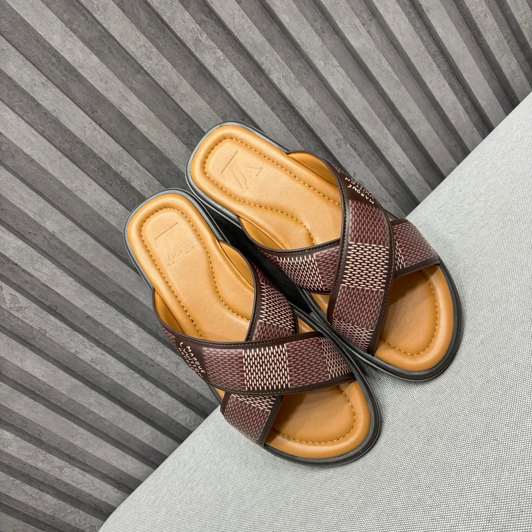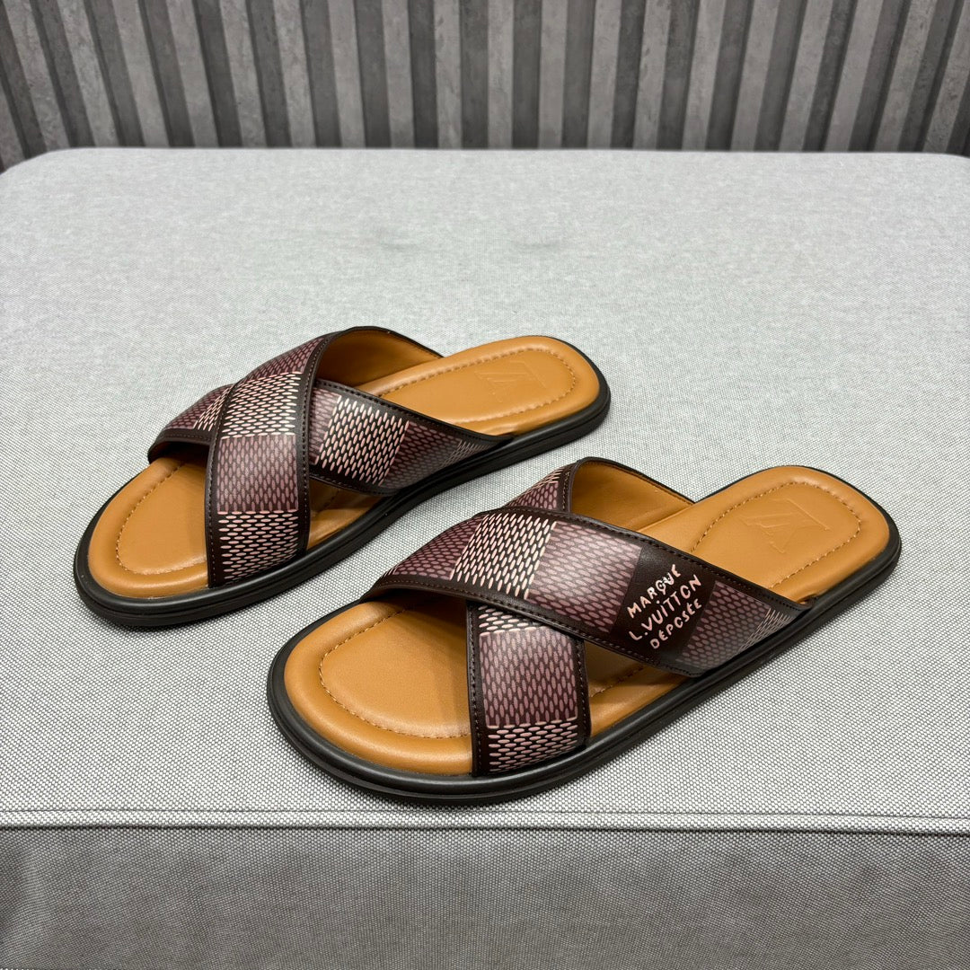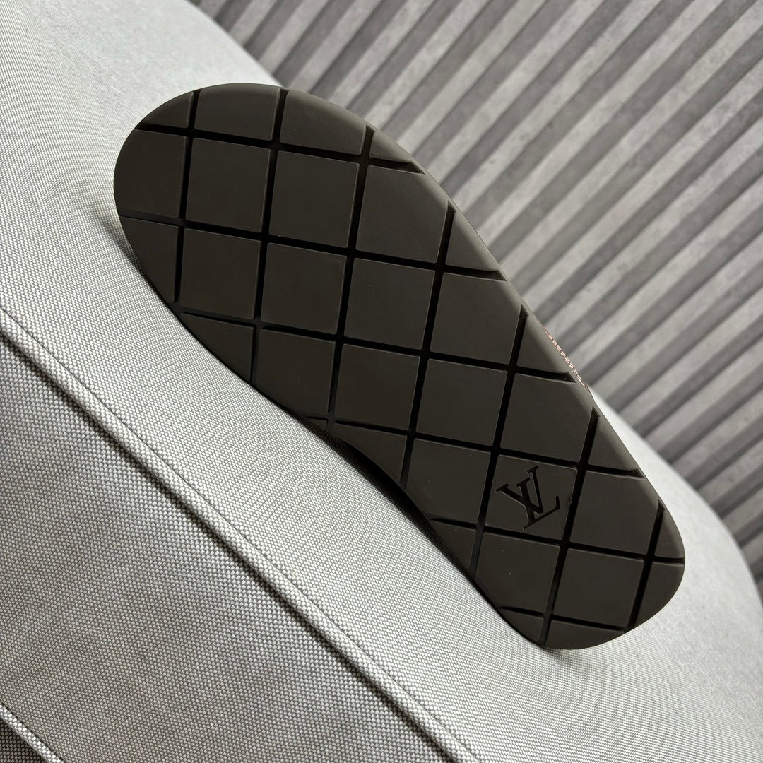 • Premium LV men's slippers, synchronizing with the 2024 early autumn runway collection. The slippers feature a high-quality fabric upper and an original, exclusive comfort sole, ensuring exceptional comfort. These are original factory-followed products.