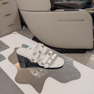 STRAPPY MEDIUM HEELED SANDALS IN WHITE STUDDED WAX-OIL SHEEPSKIN