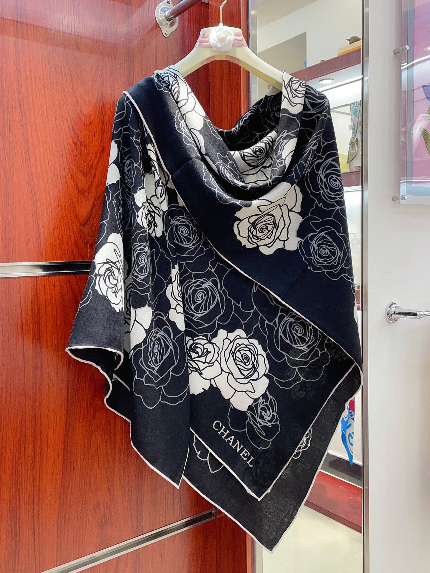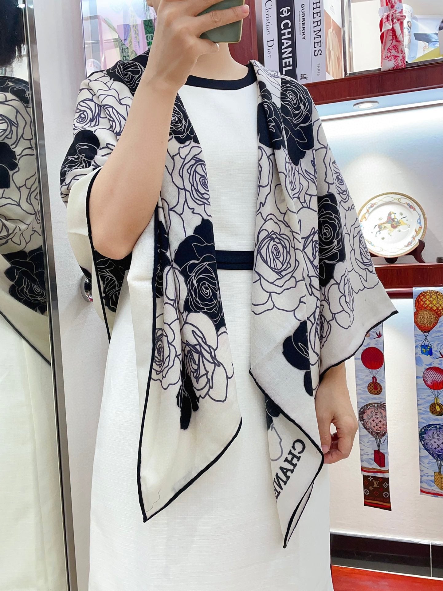 CC Scarf 200 CM In Black Mix White Small Flower Cashmere Silk 351690