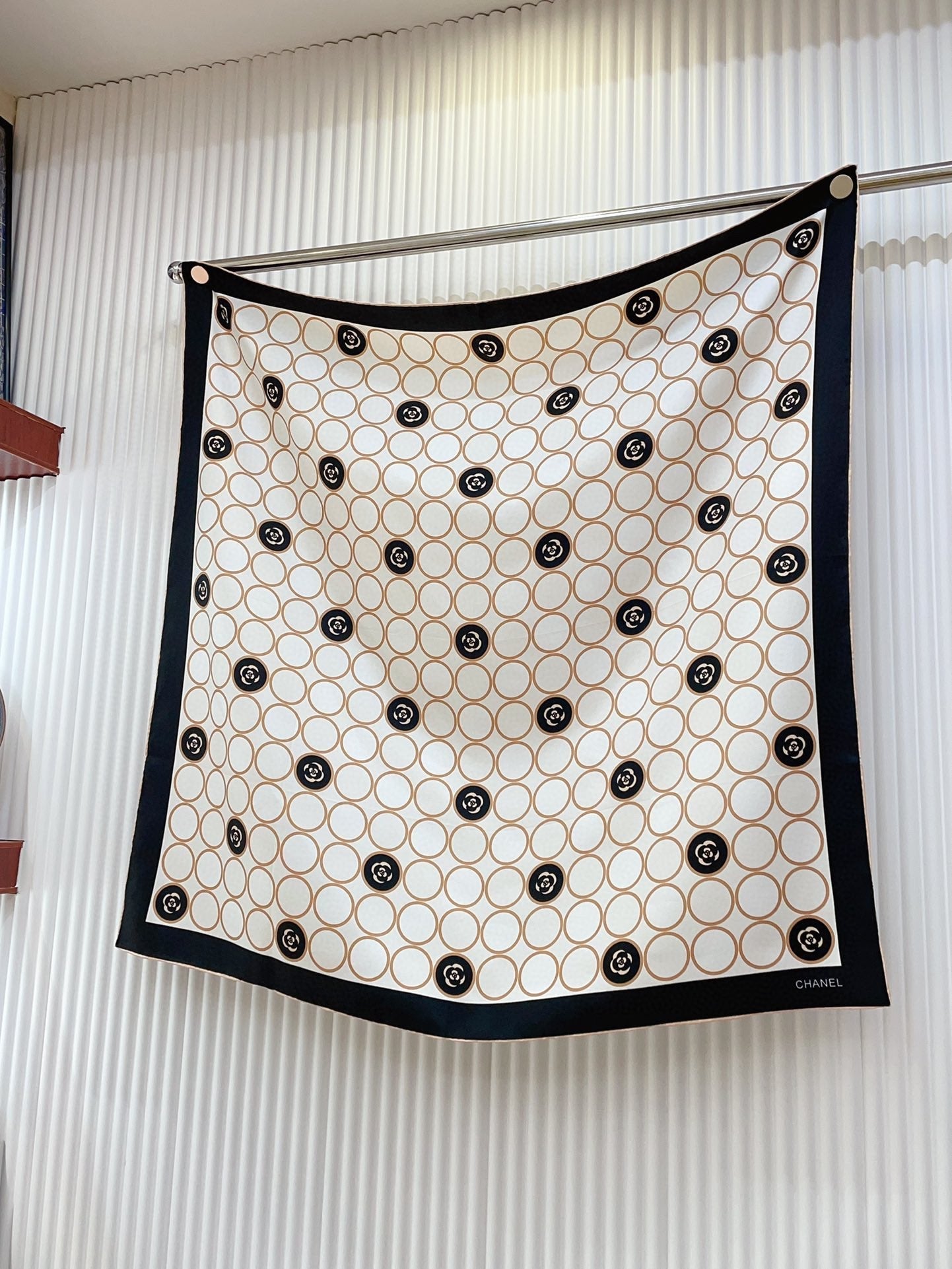 CC Square Scarf 90 CM In Black Polka Dot White Camellia Silk Twill 288723