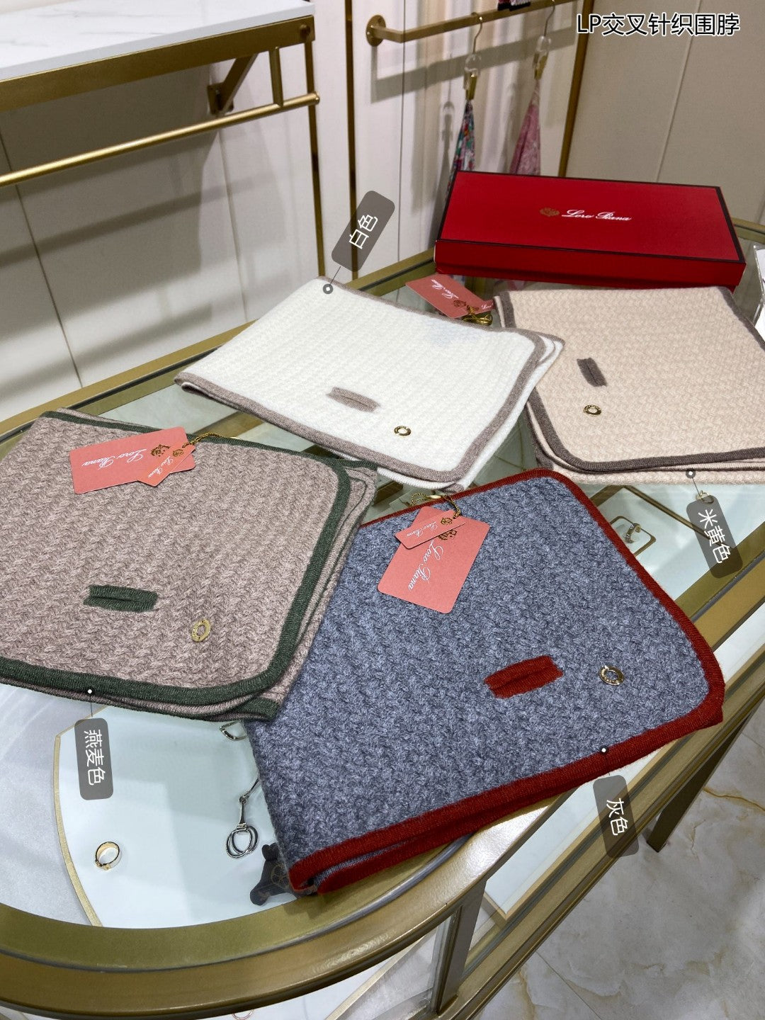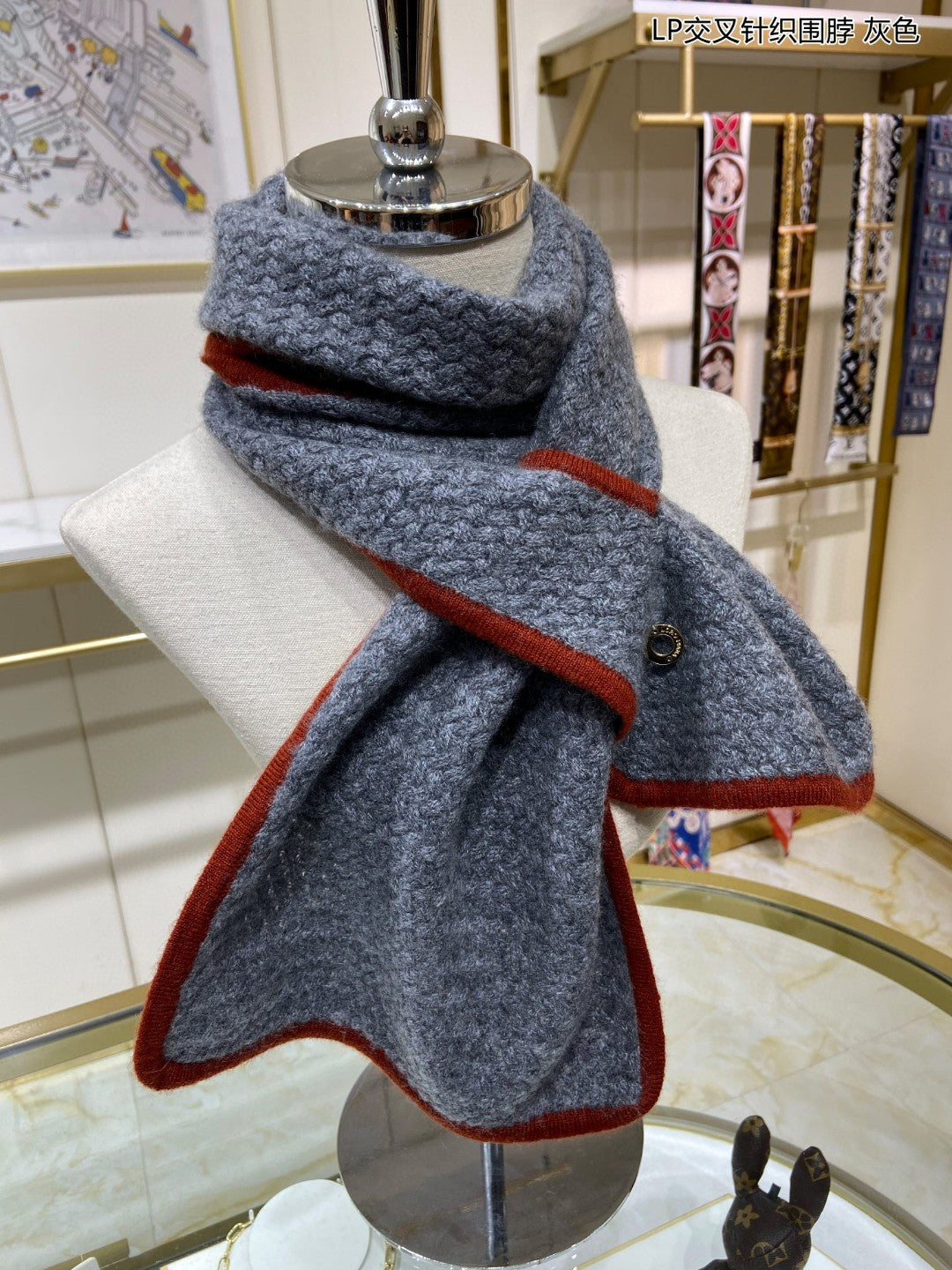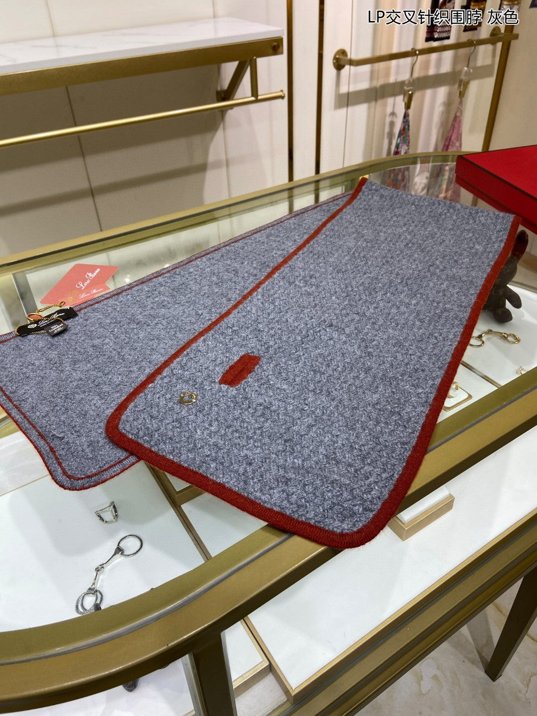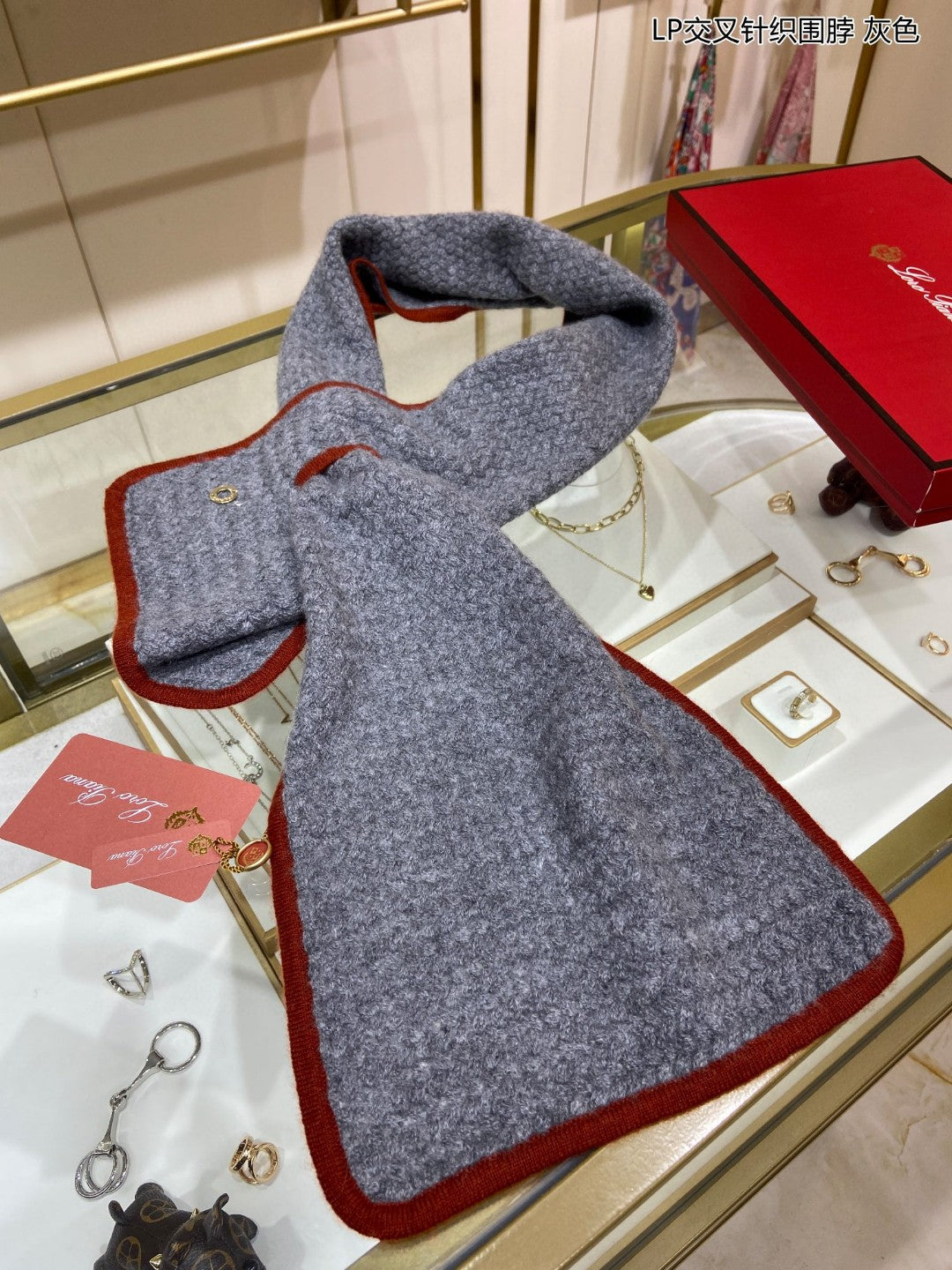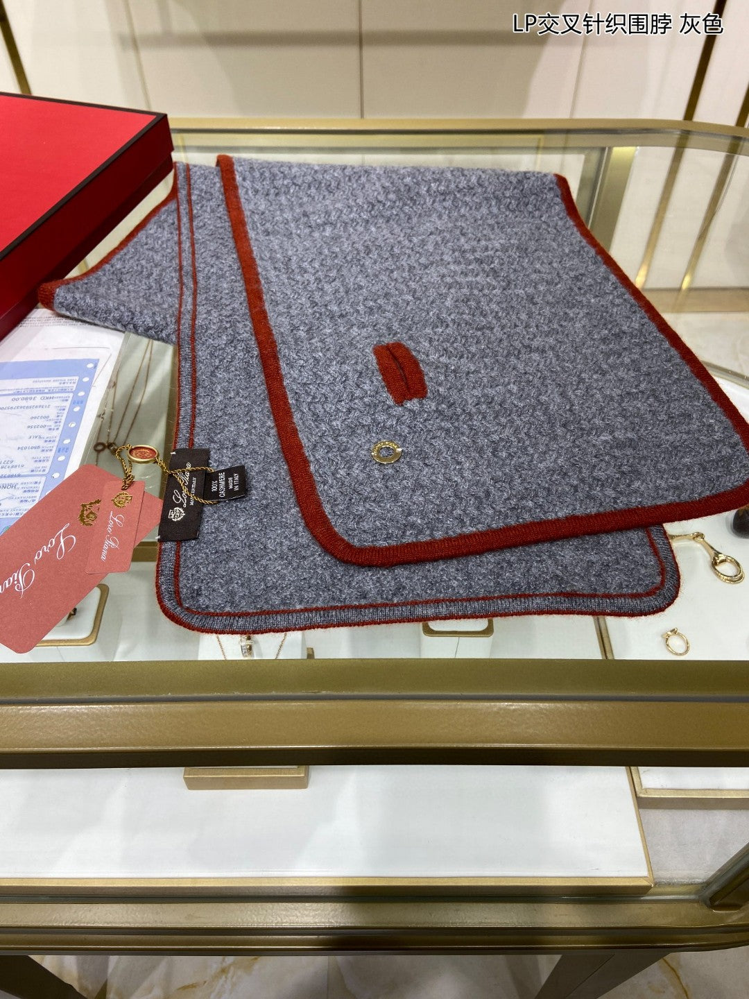 LP Scarf 125 CM In Dark Grey With Red Border Cashmere 201756