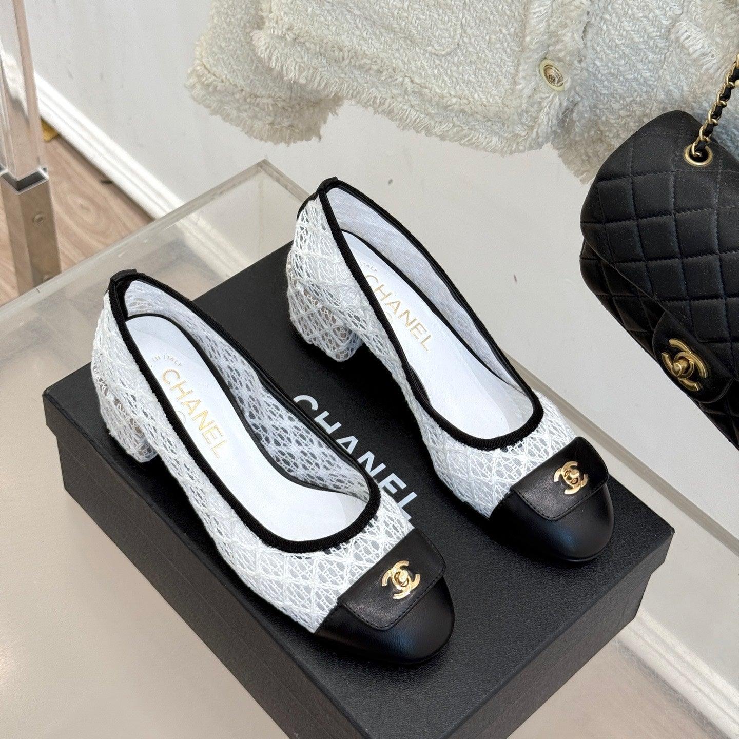 CC 25 Mary Jane White Black Mesh Calfskin