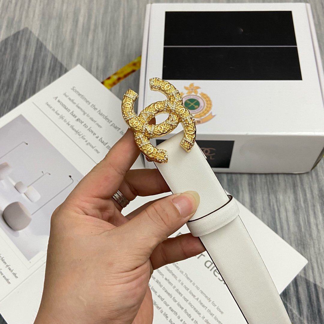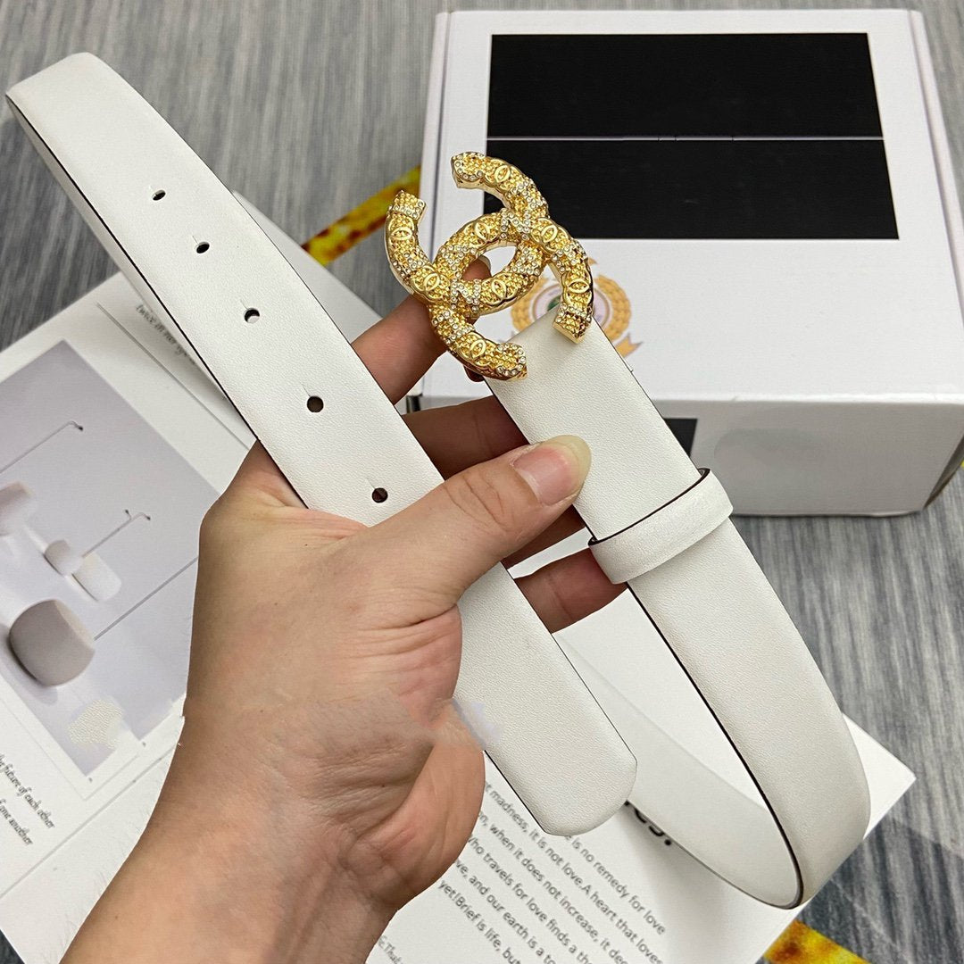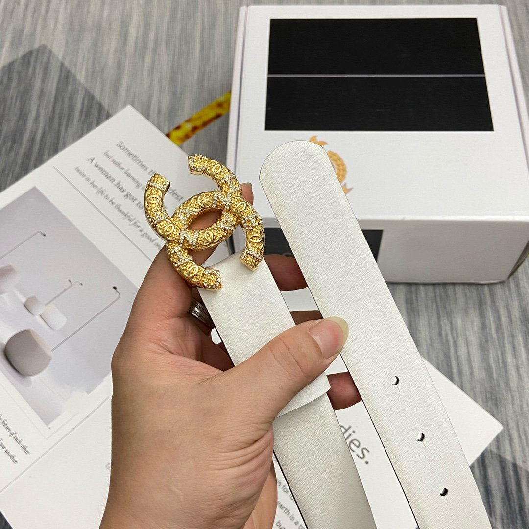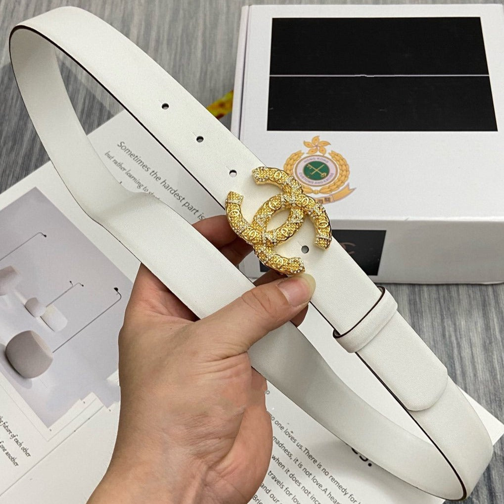 CC BELT 30MM BUCKLE GOLD DIAMOND LEATHER WHITE