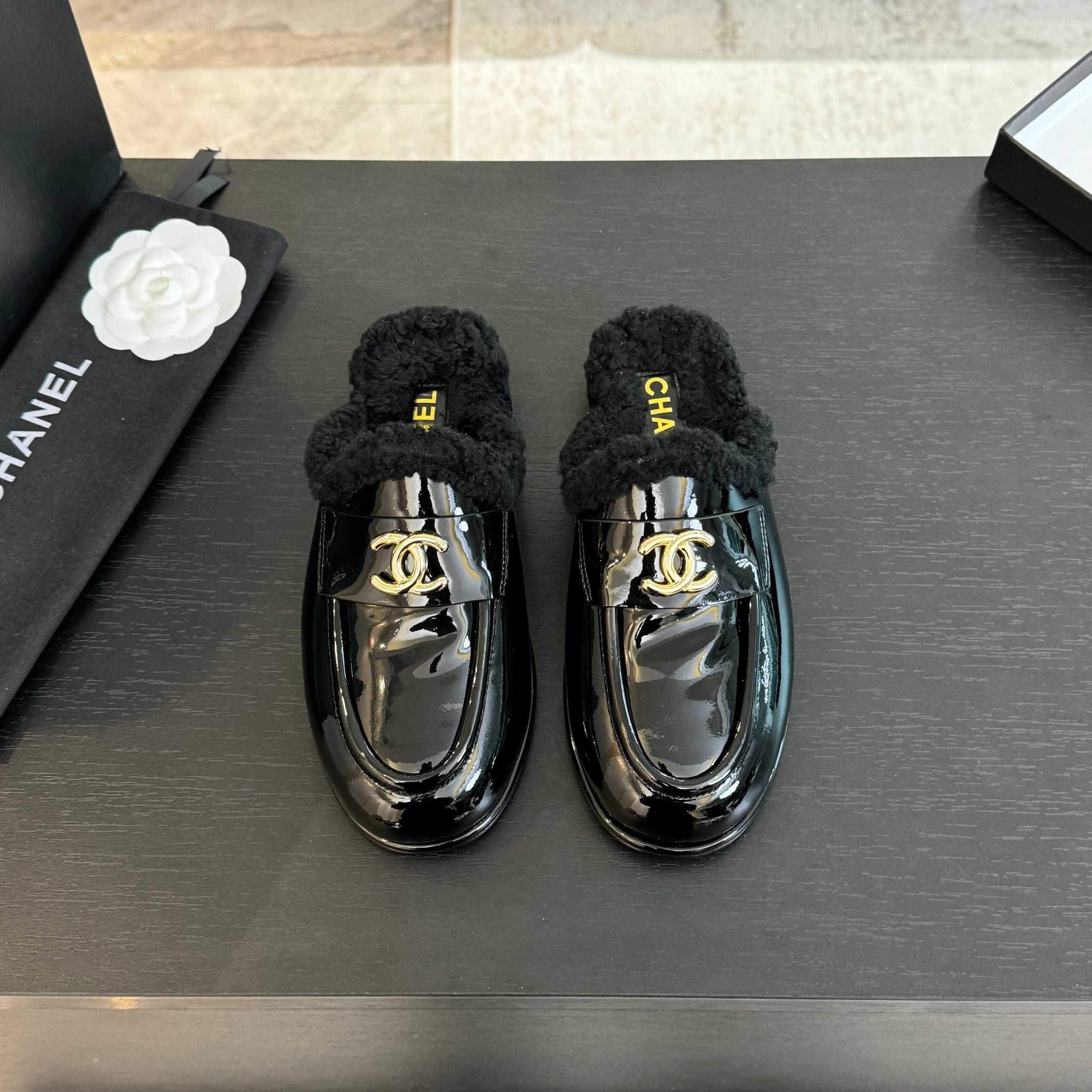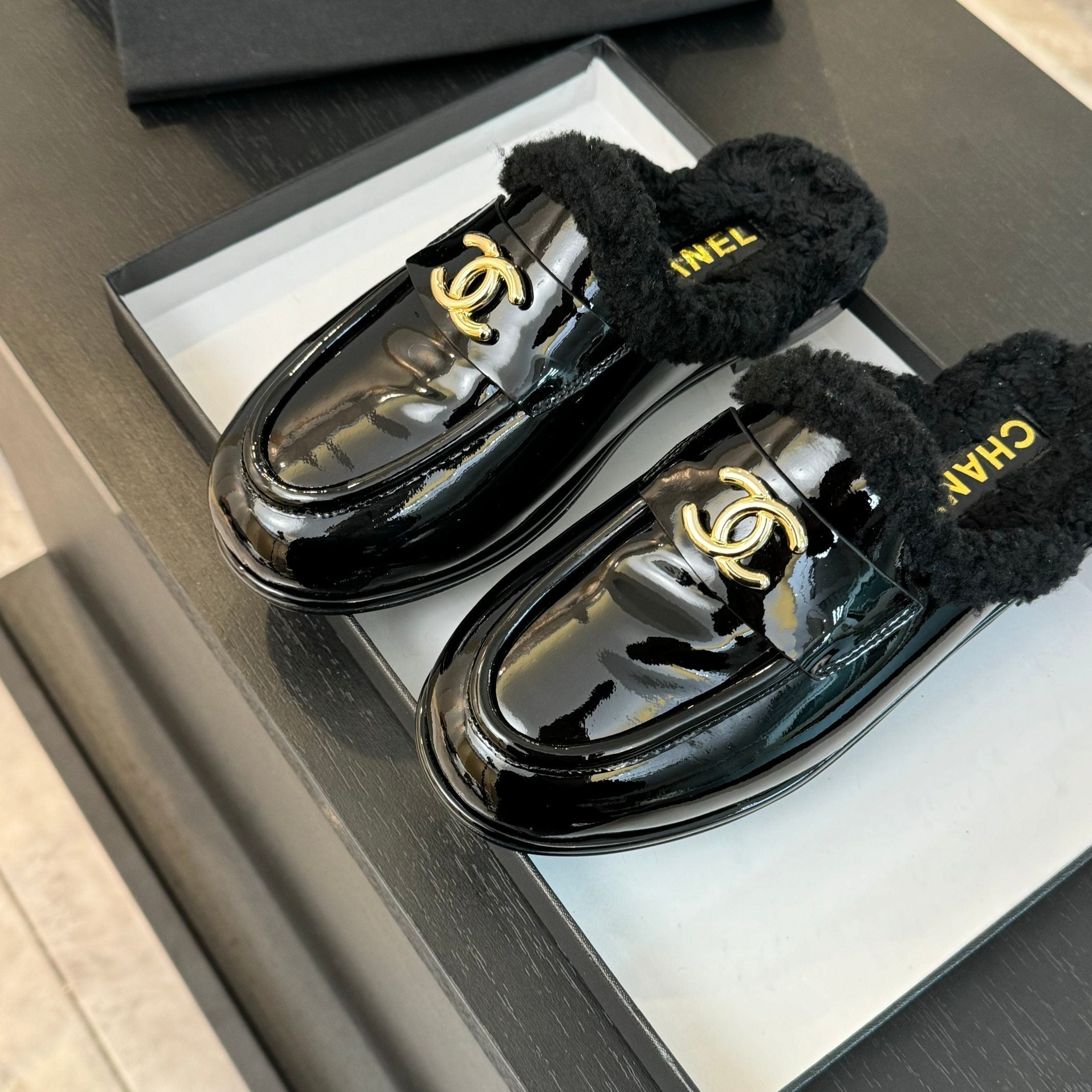 CC Mule Black Patent Calfskin Lamb Wool