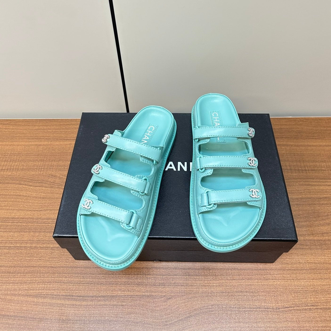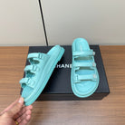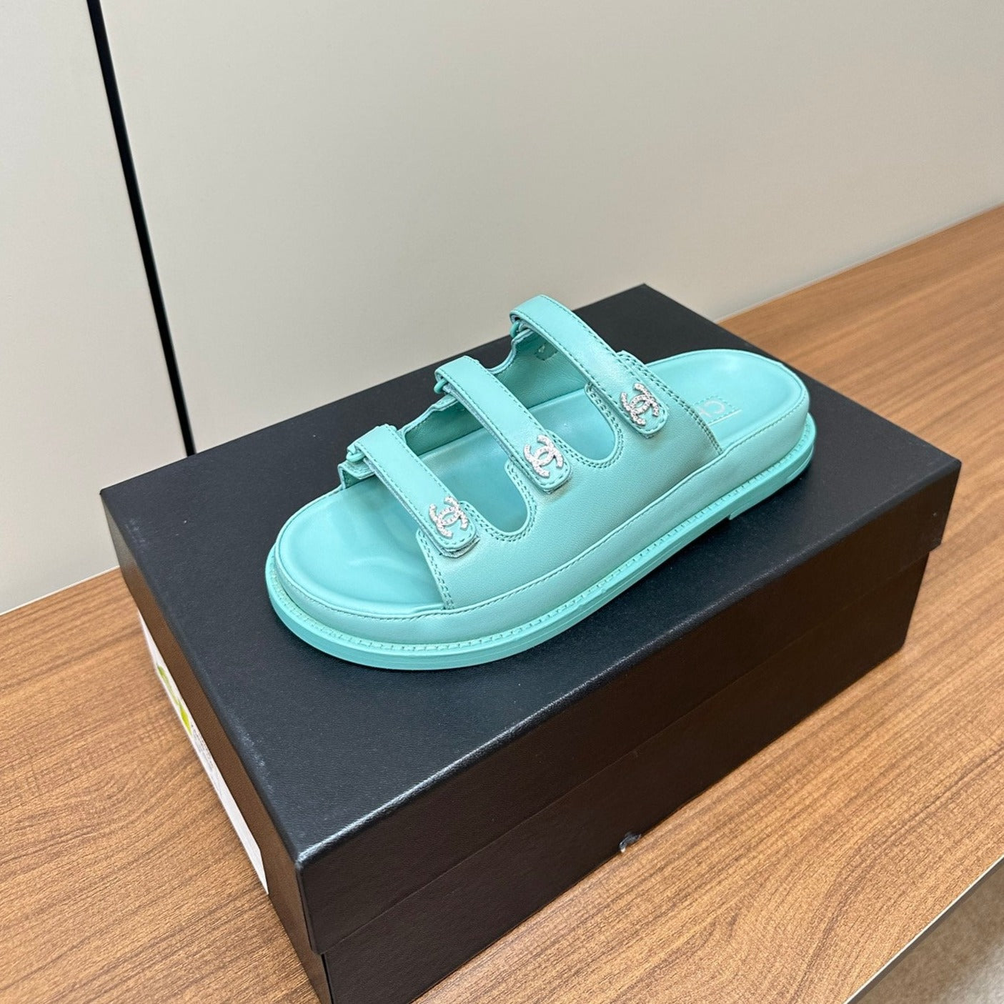 dad sandals sky blue triple strap lambskin mules