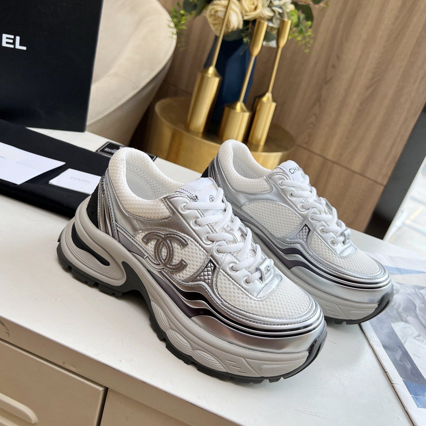 cc trainer black calfskin white mesh