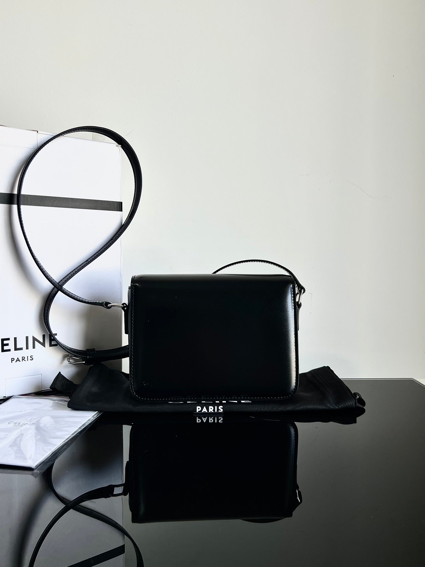 - Color: BLack leather, Gold hardware