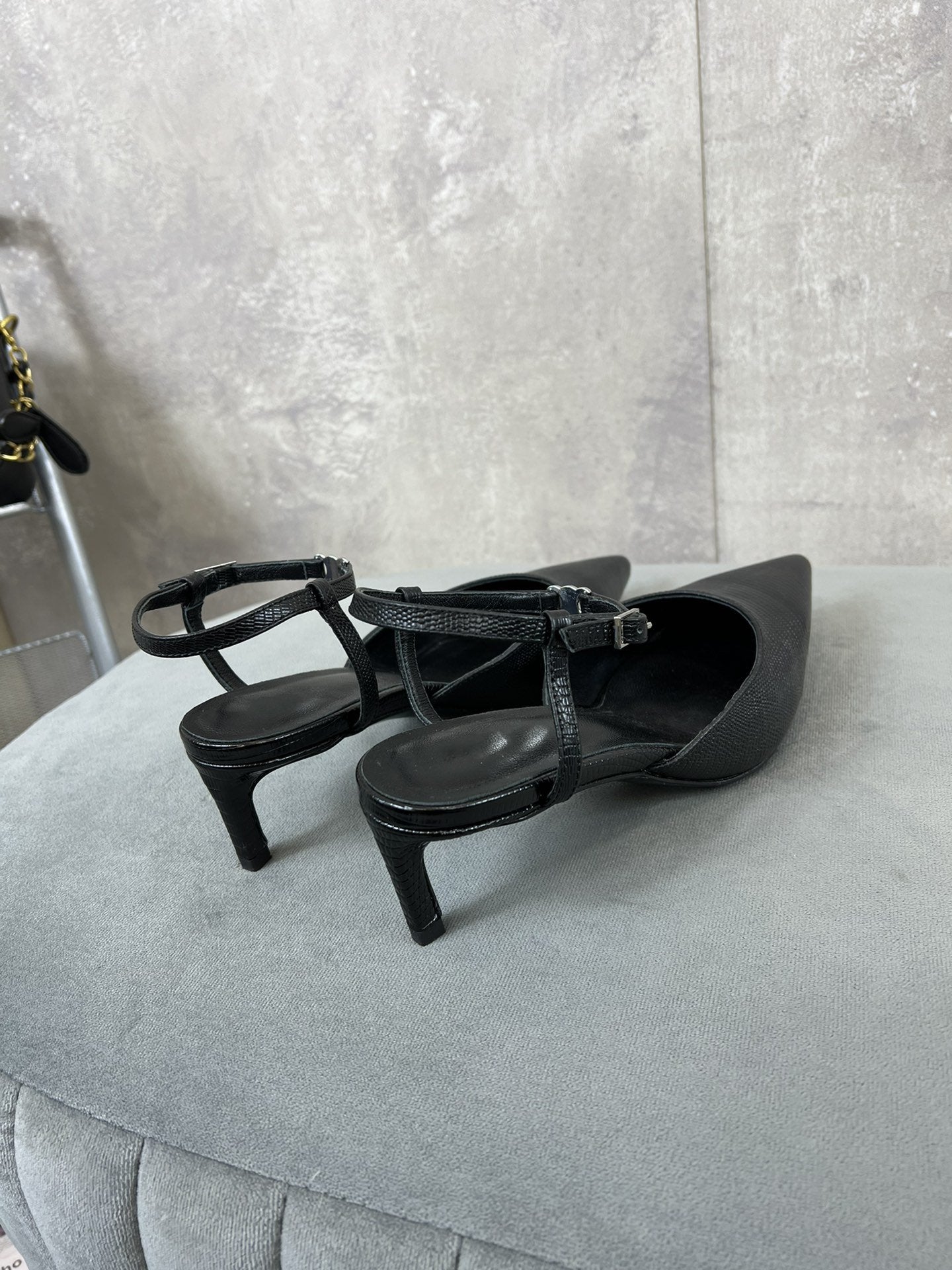 cl kitten with strap 45 black lizard stamped calfskin