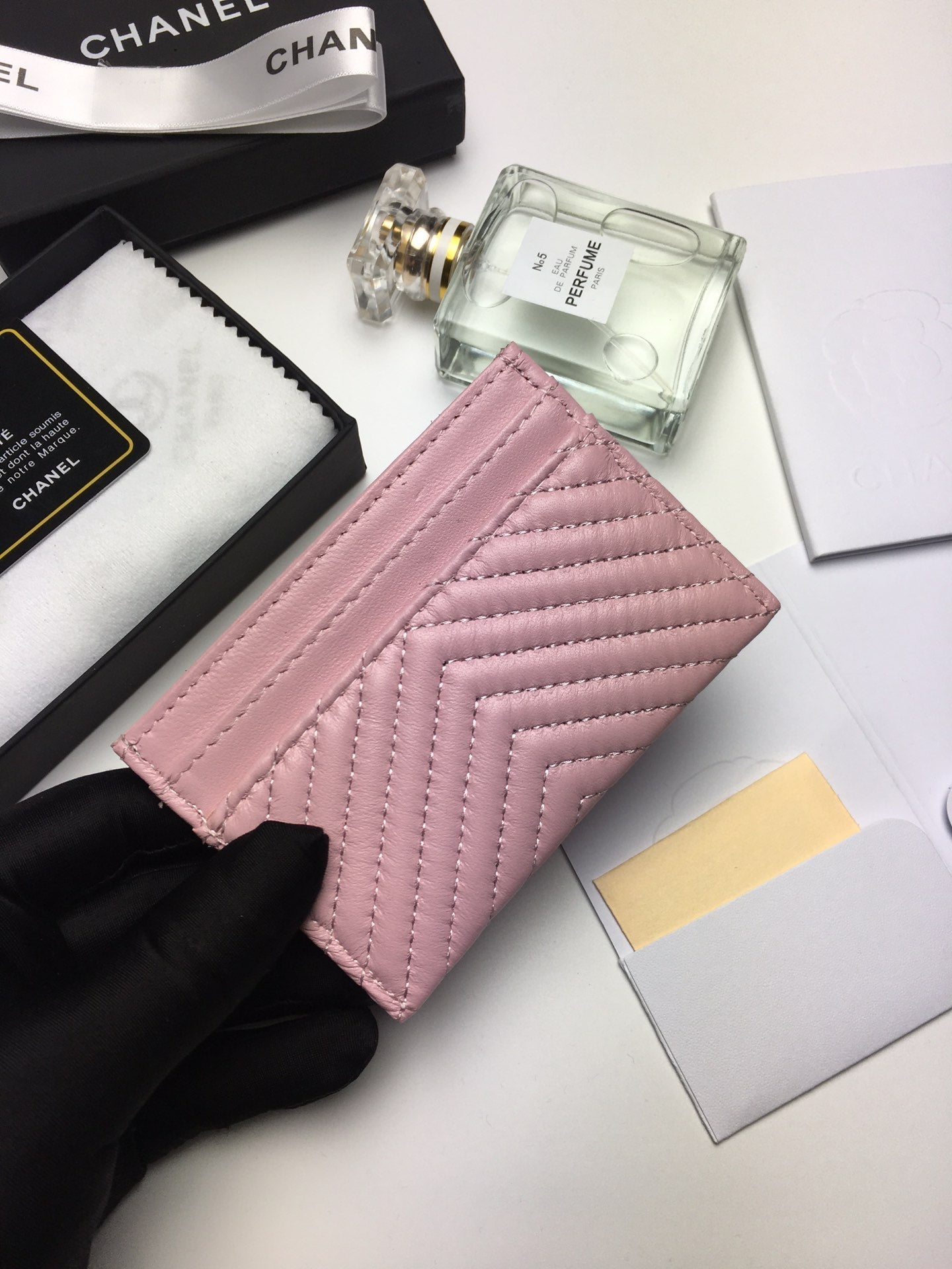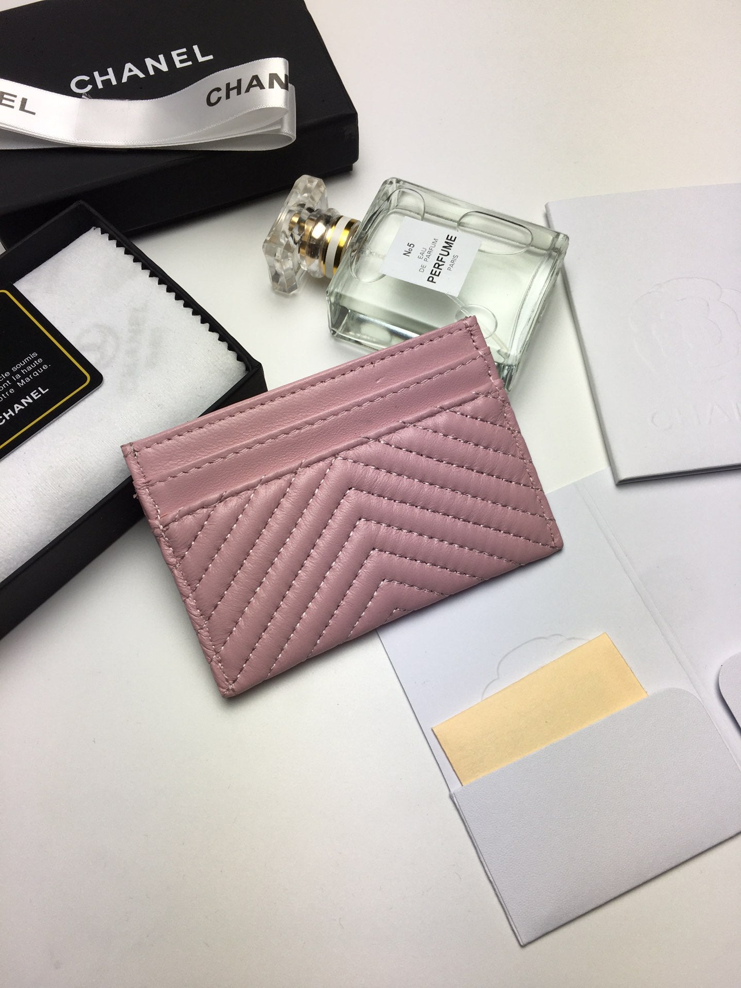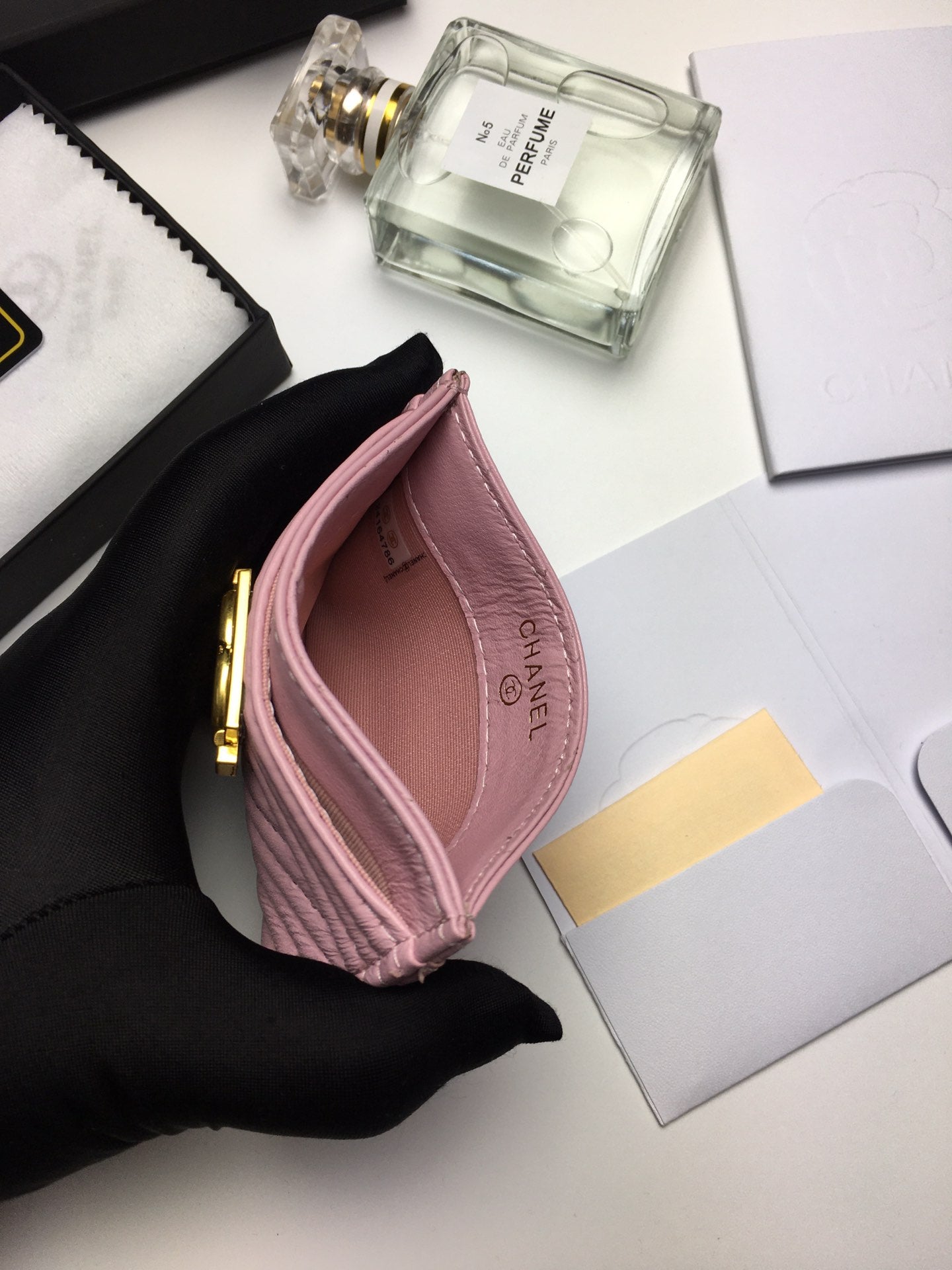 CC LINE CARD HOLDER 11.2 BABY PINK CALFSKIN GOLD ICON