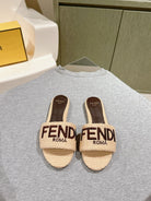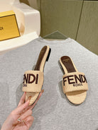 FENDI SIGNATURE MULE SLIDES IN BEIGE FIBRE WITH BROWN EMBROIDERED LOGO