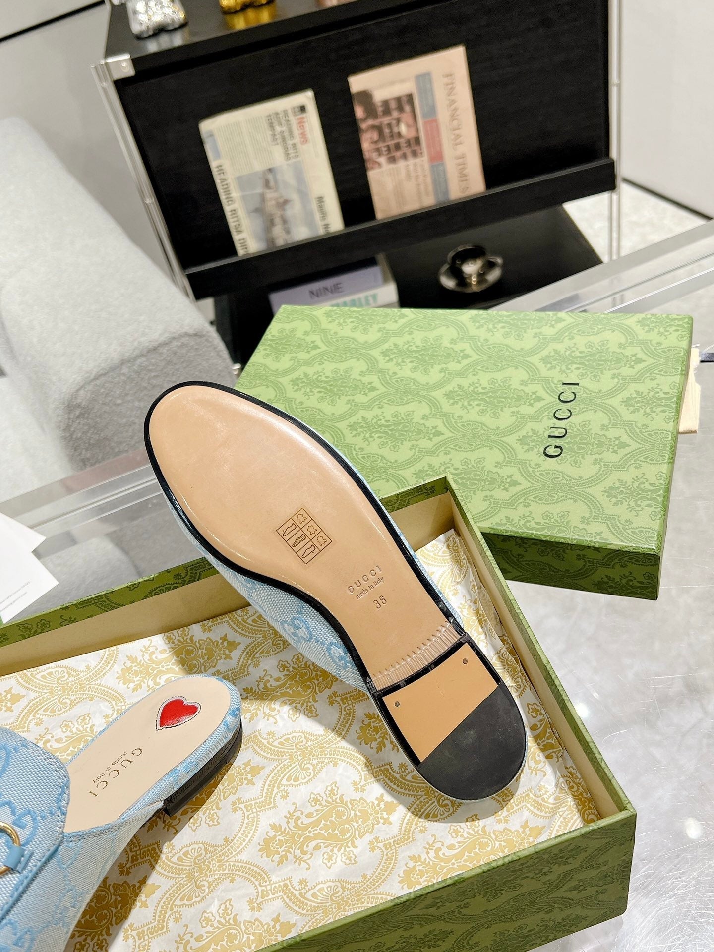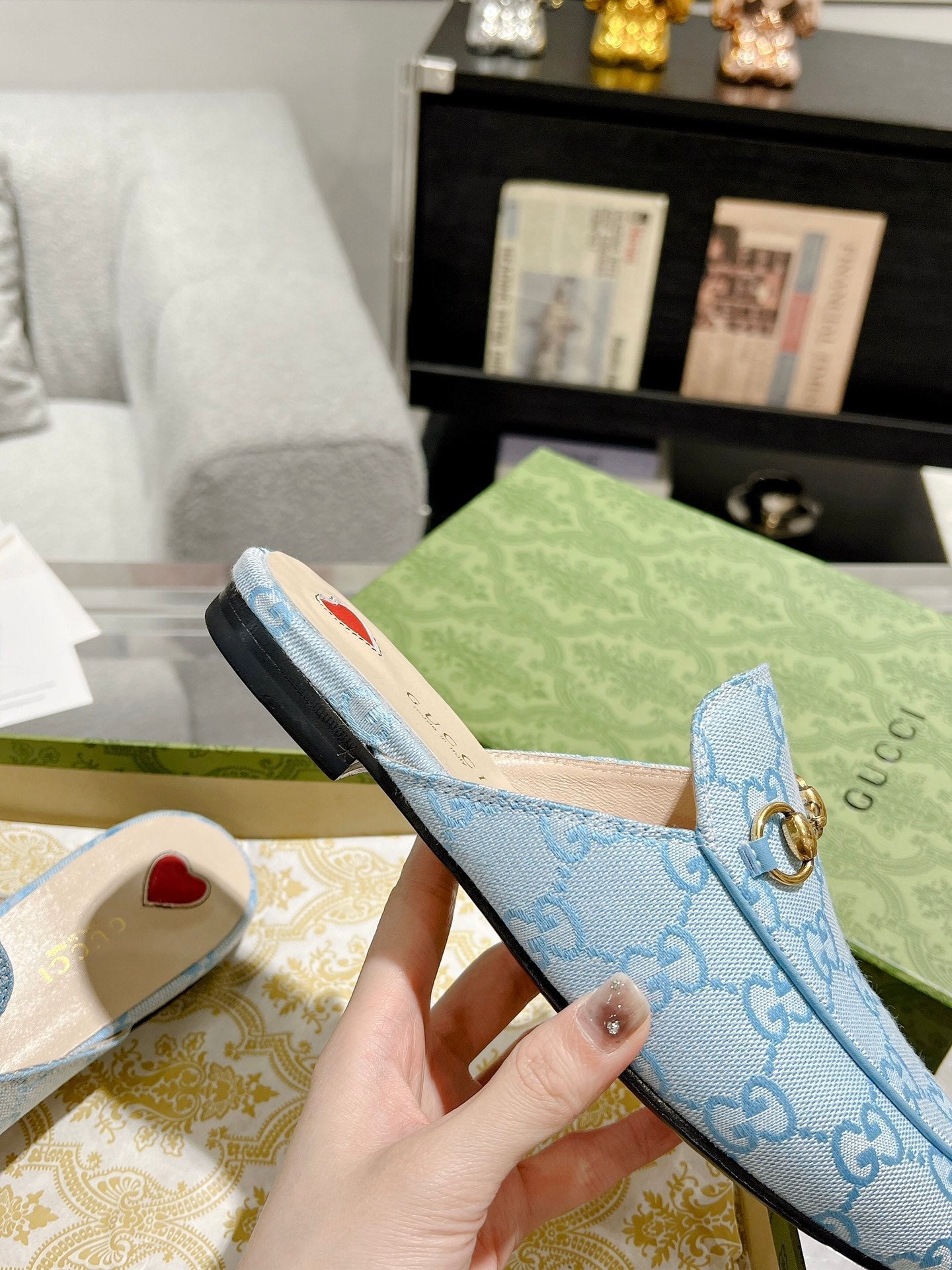 MEN'S MULE WITH HORSEBIT IN LIGHT BLUE MONOGRAM JACQUARD FABRIC