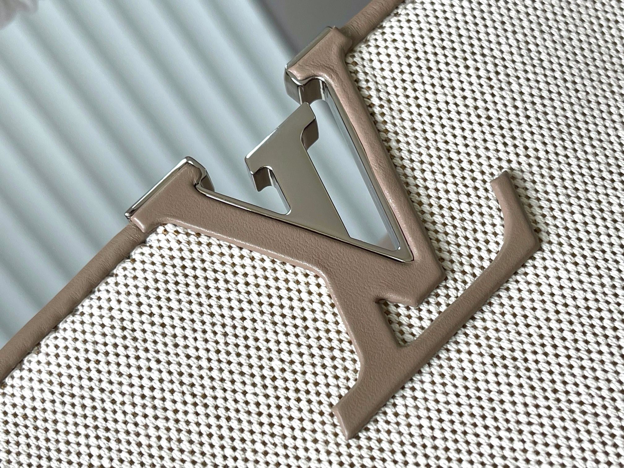 CAPUCINES SOUPLE GM 38 IN WHITE CANVAS AND TAUPE CALFSKIN TRIM