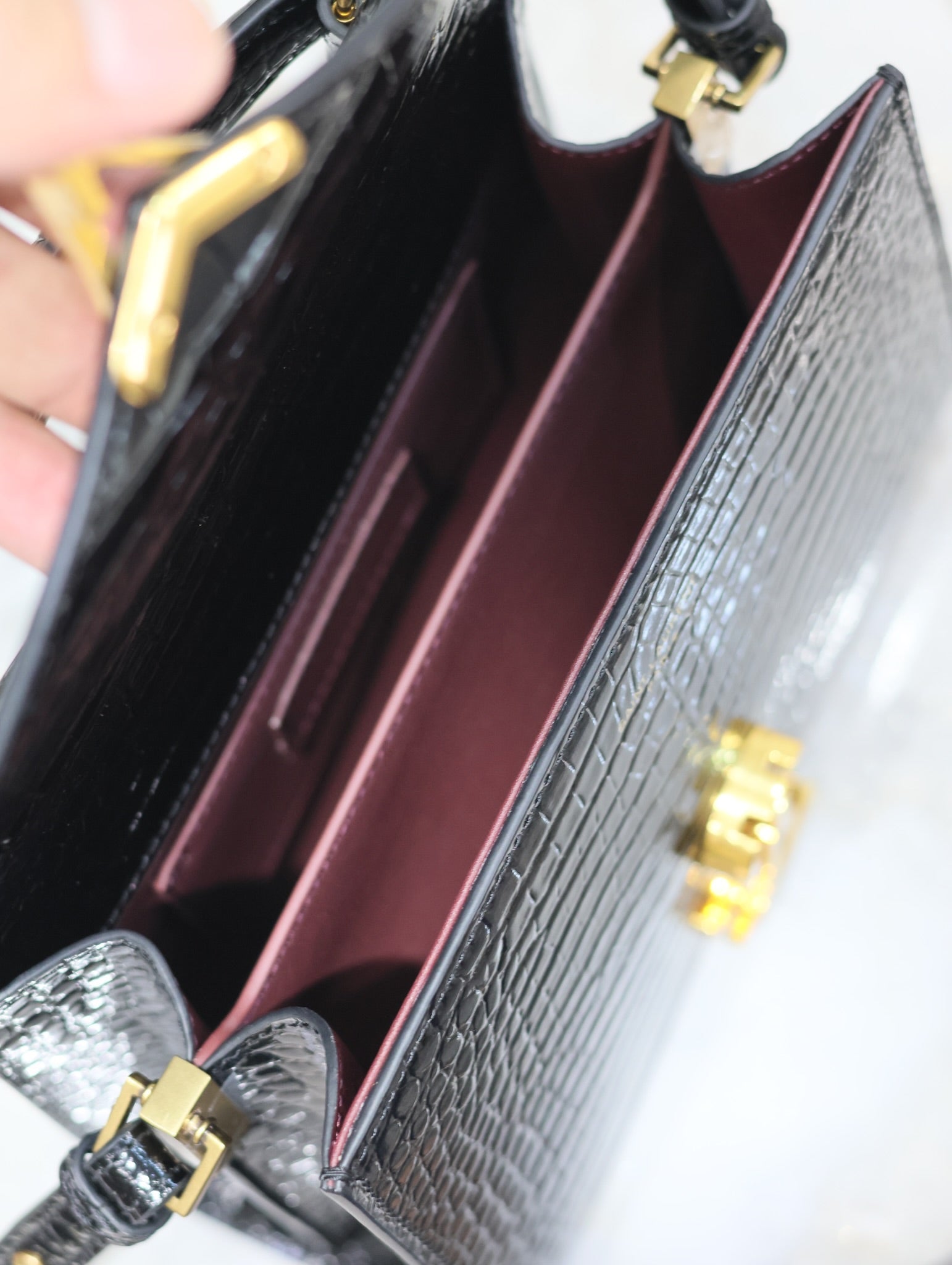 CASSANDRA TOP HANDLE BAG 24 IN BLACK CROCODILE-EMBOSSED GLOSSY CALFSKIN