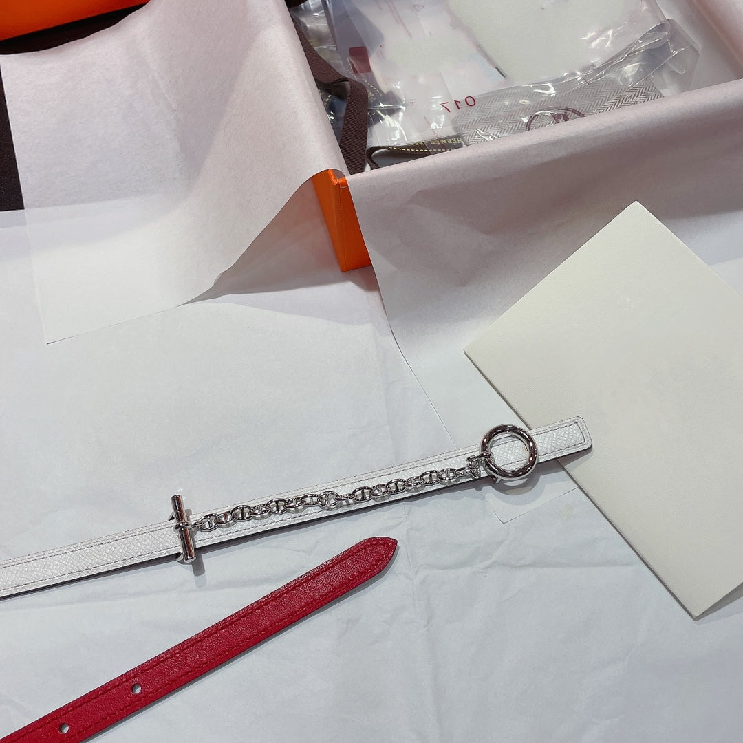 H SILVER BUCKLE WOMEN'S BELT WHITE RED LEATHER STRAP 1.3CM