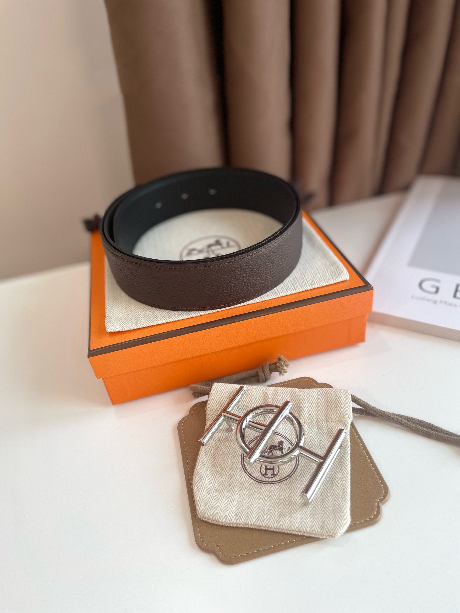 H ULYSSE BELT 38MM SILVER BUCKLE BLACK CHOCOLATE LEATHER