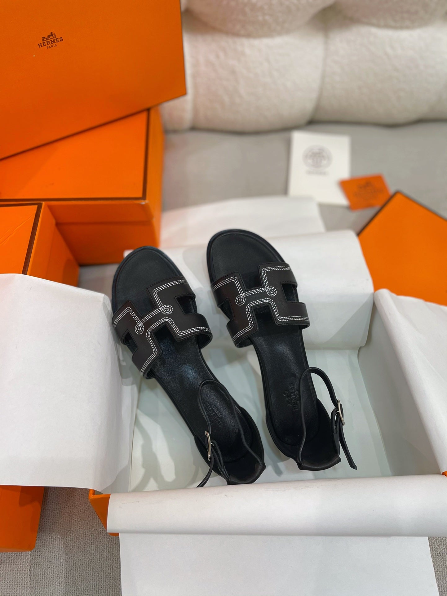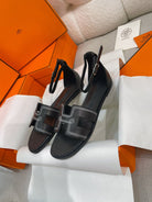• Material: Sandal in Clafskin with straight cut edges, "H" cut-out detail and thin ankle strap.