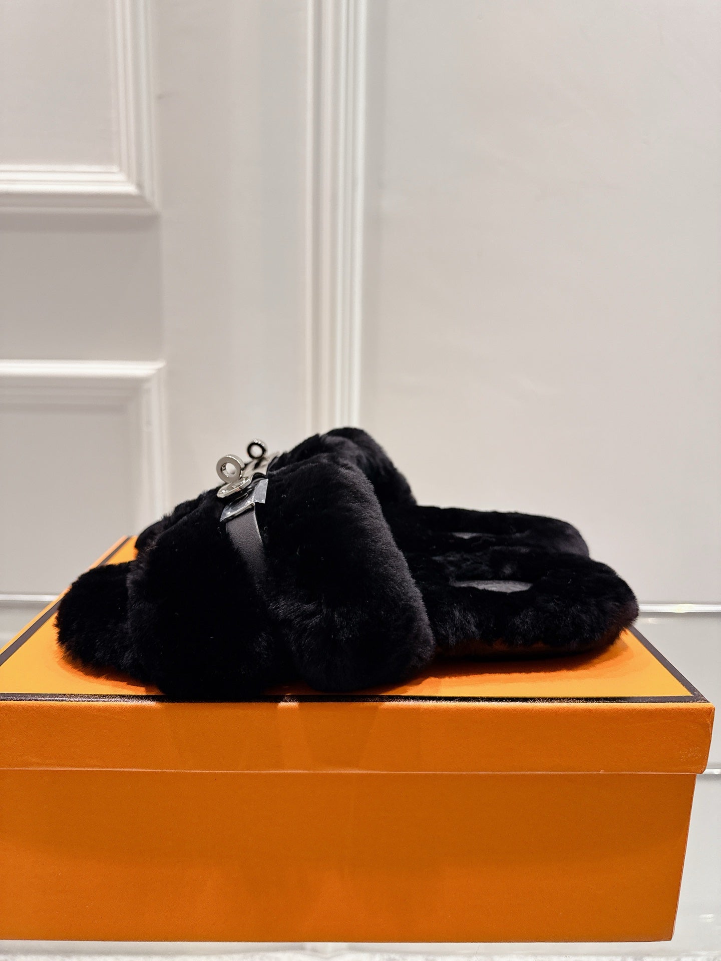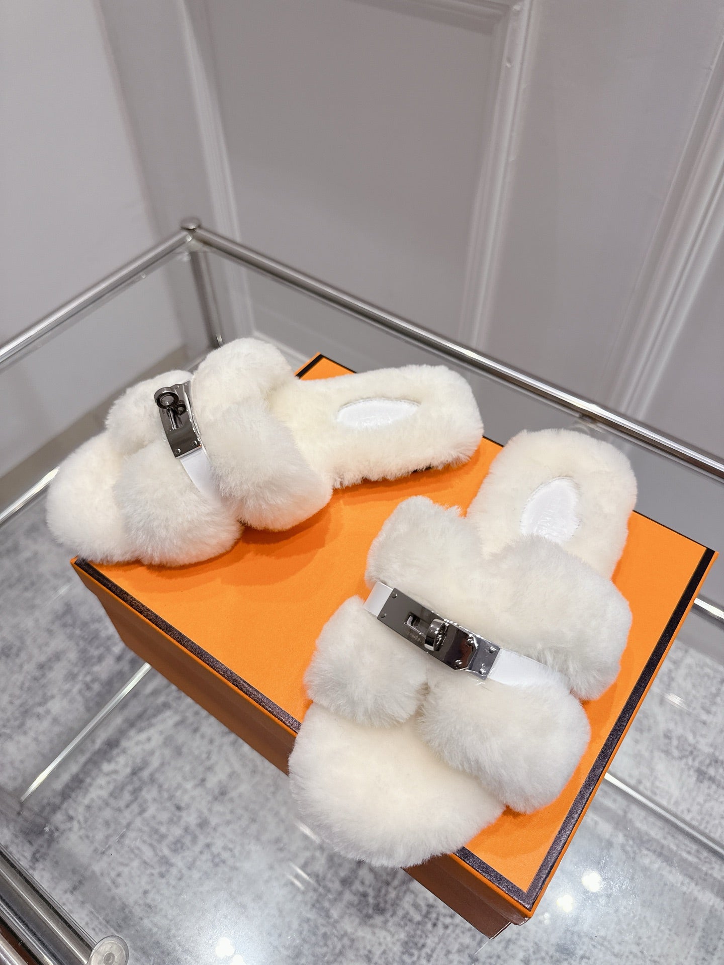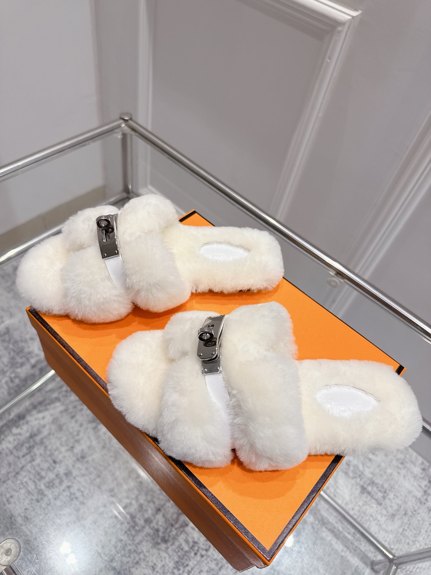 HM Oran slippers sliver buckle white wool