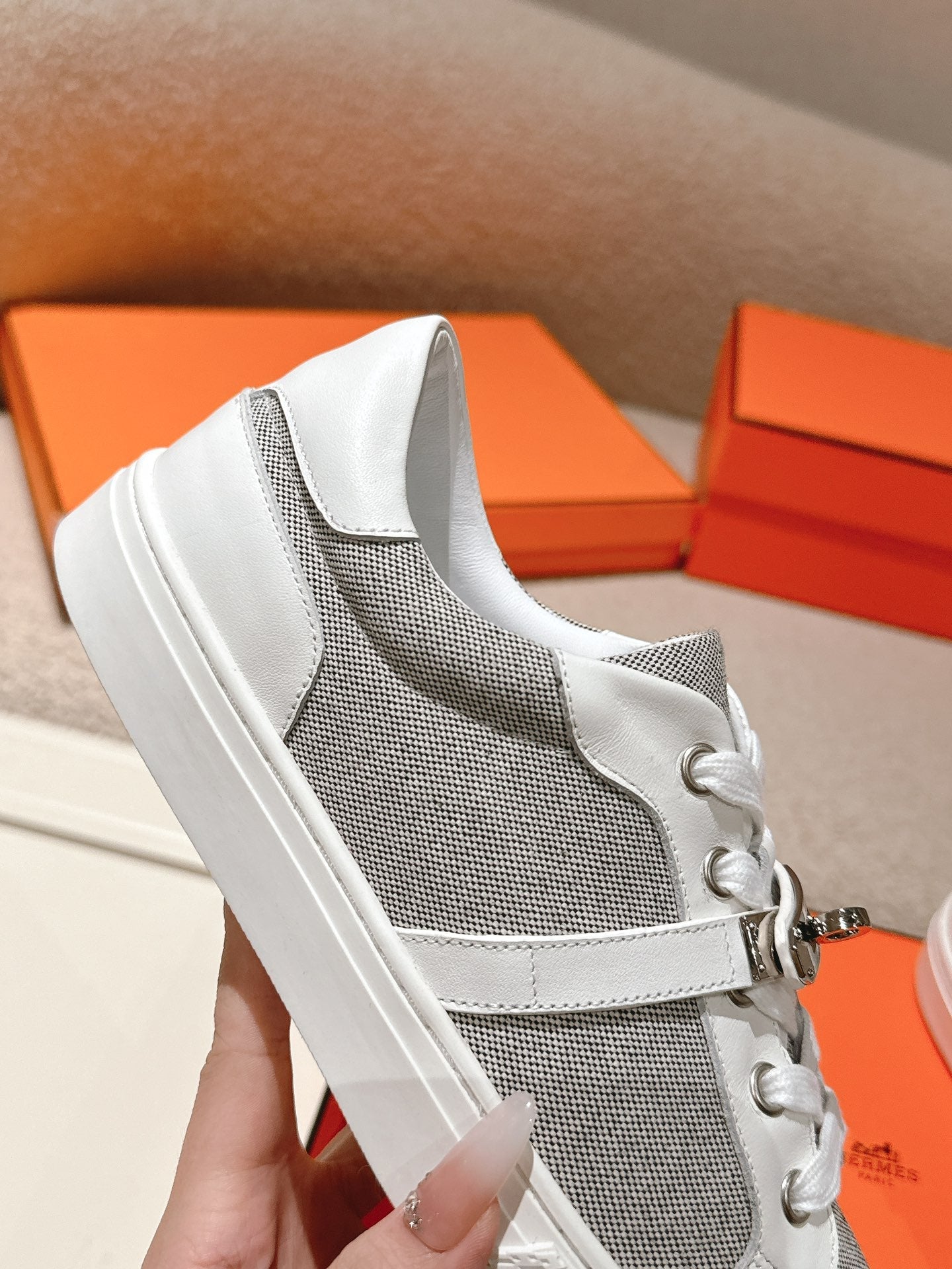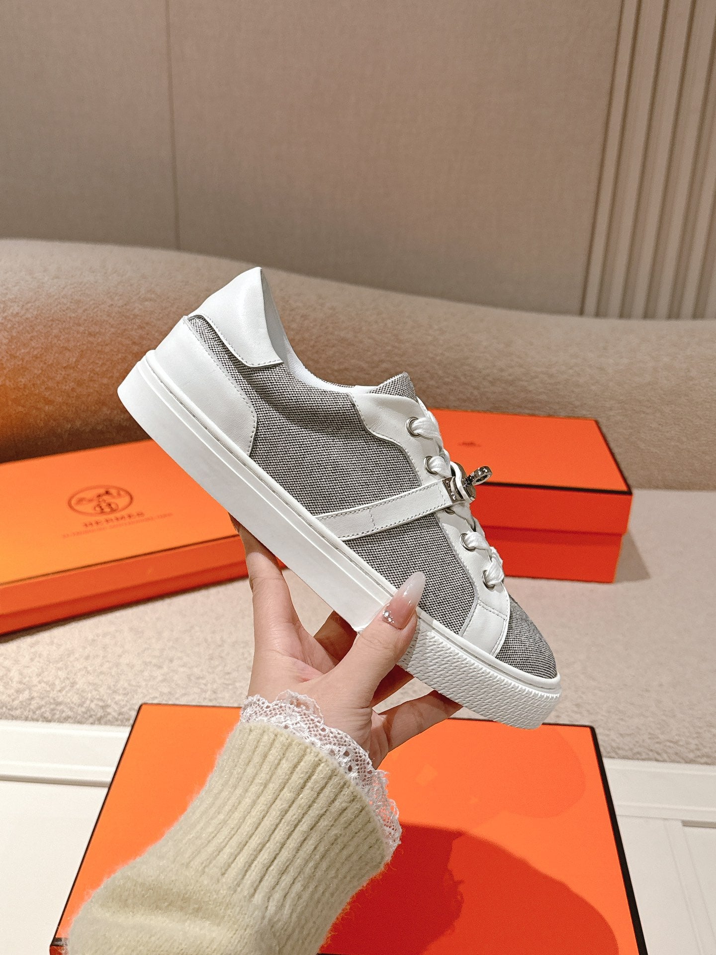 HM couple's sneakers white light beige suede