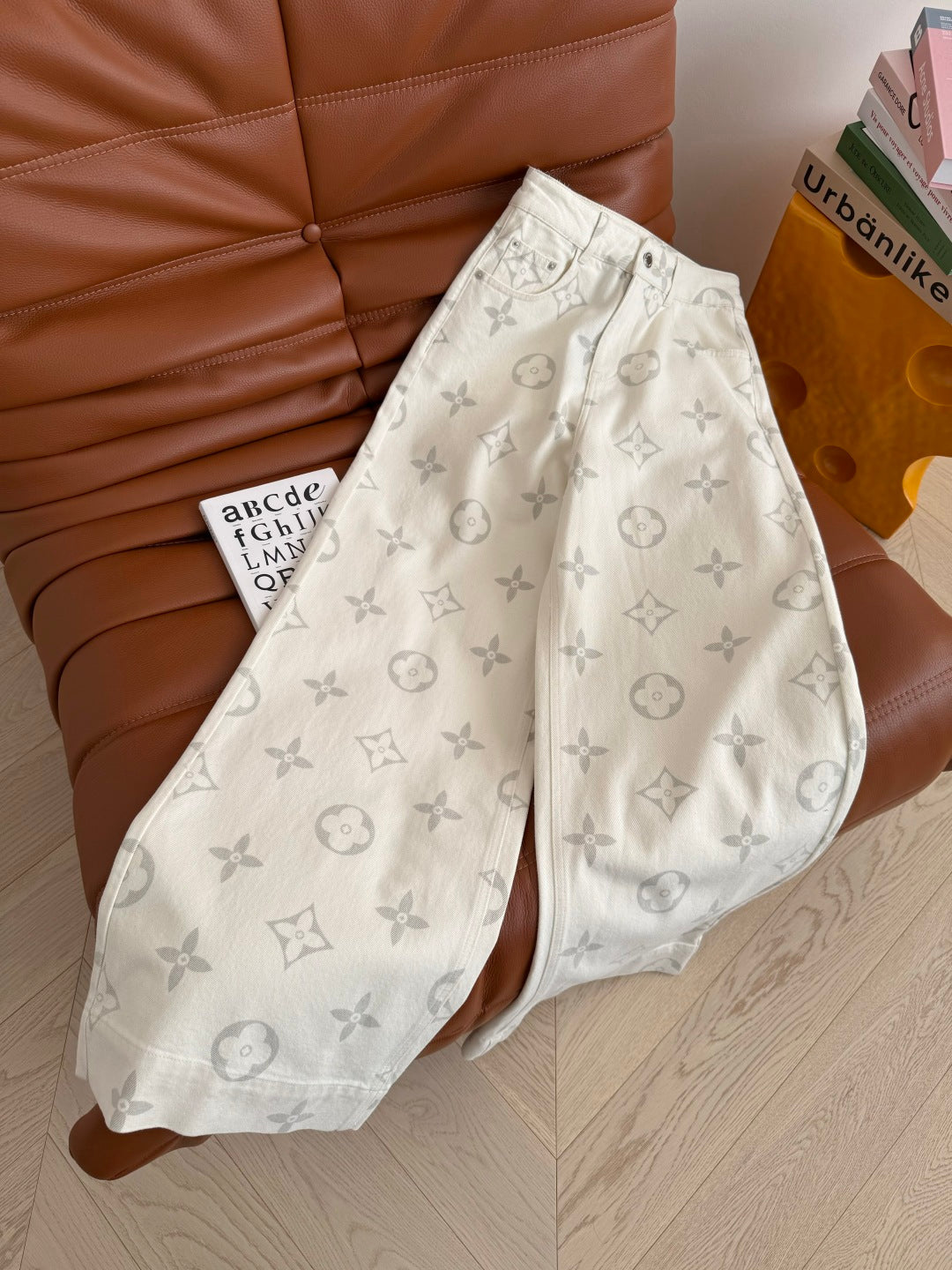 LV 25 Classic Monogram Pattern Wide-Leg Jeans Cotton