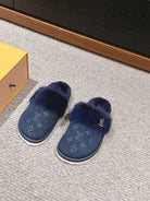 LV Flat Mule Charcoal Blue With Fur Monogram Suede