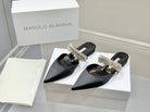 Manolo Flats Mules Diamond Buckle Black Silk Satin 327485