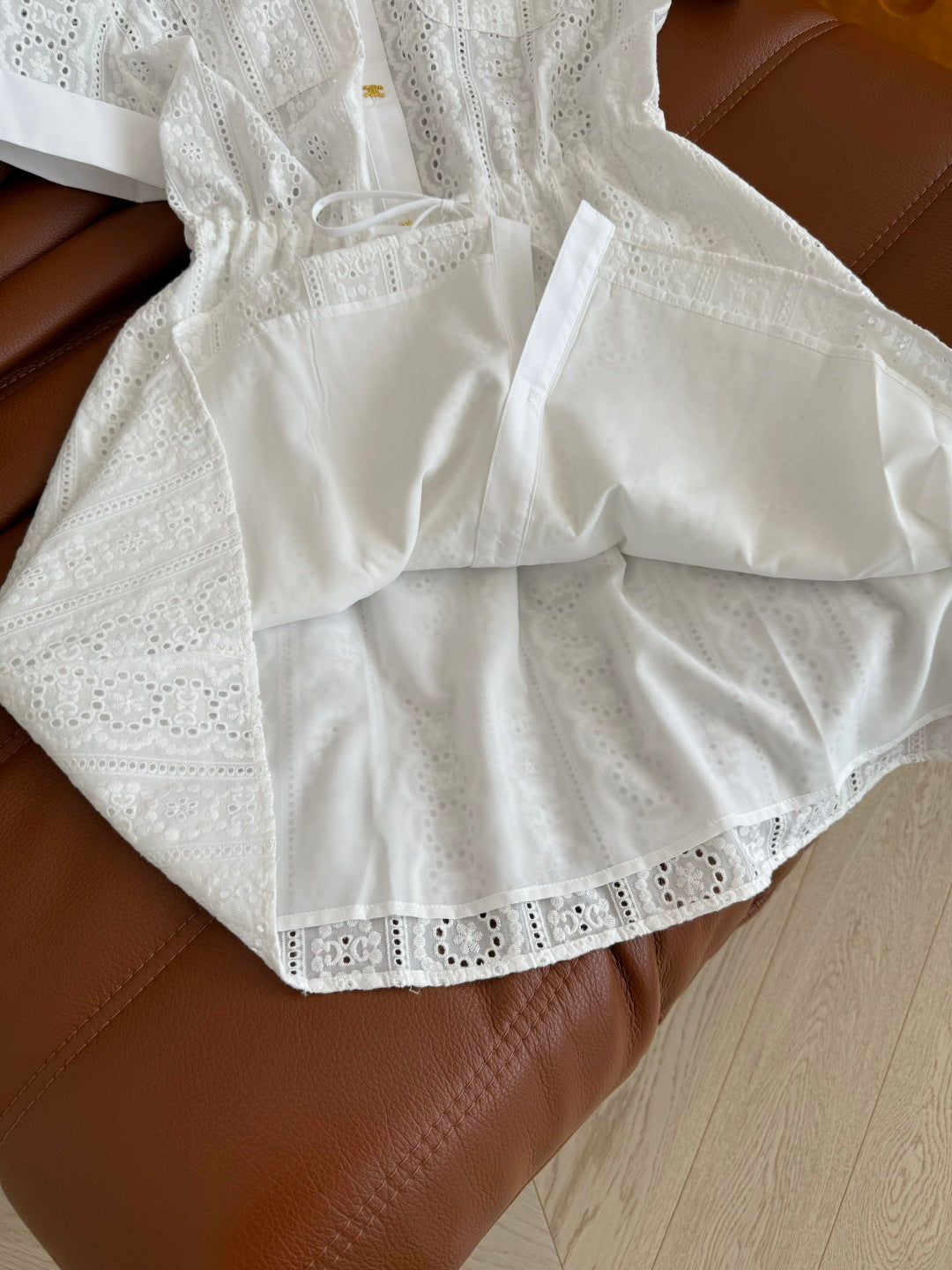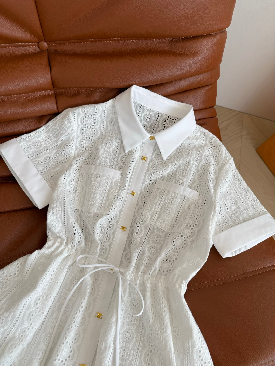 Celine 25 Hollow Shirt Dress with Gold Metal Button White Cotton