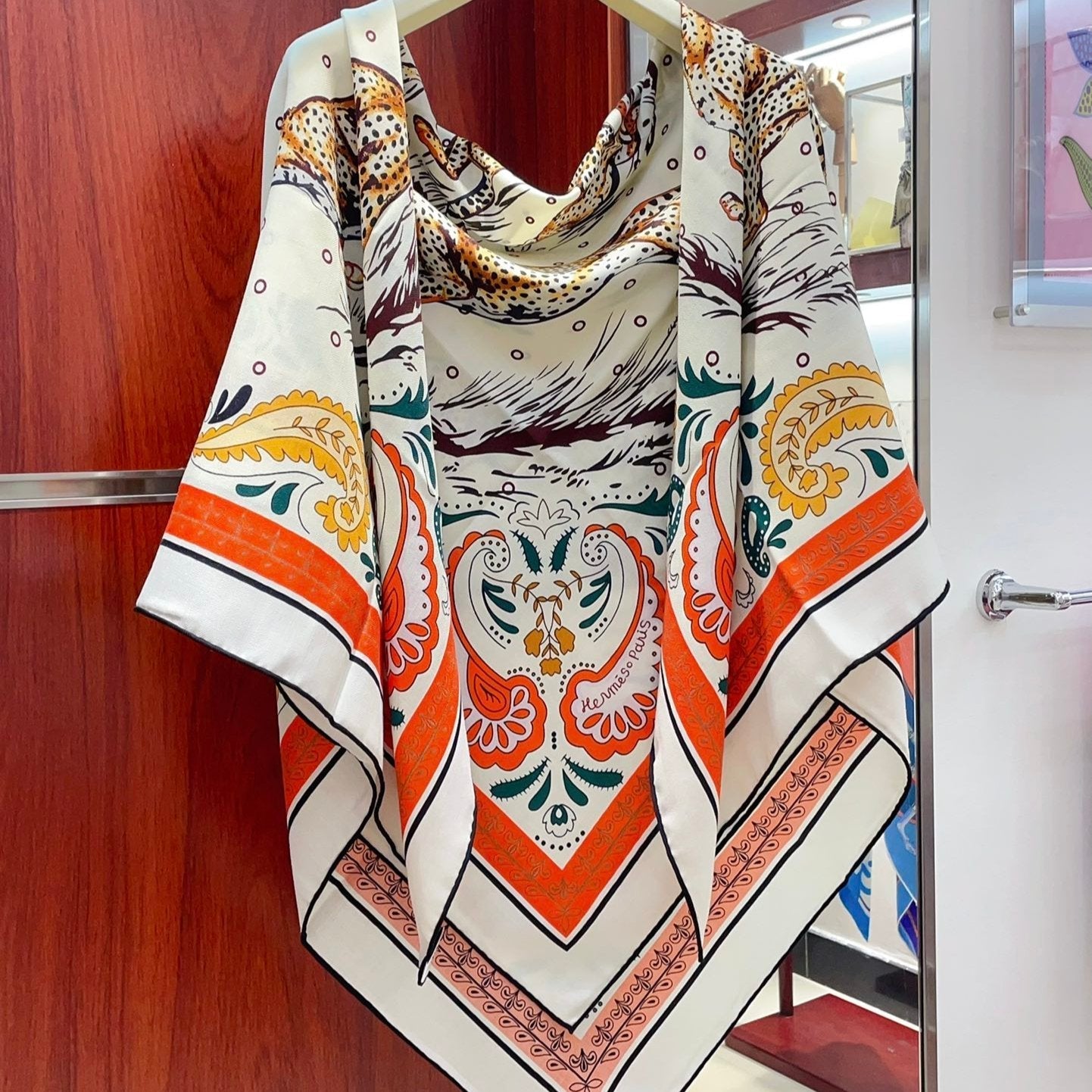 Guepards Bandana Double Face Scarf 140 CM In White Mix Red Colorful Cashmere And Silk 334190