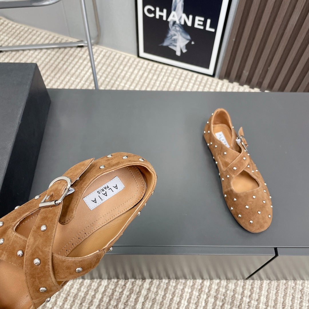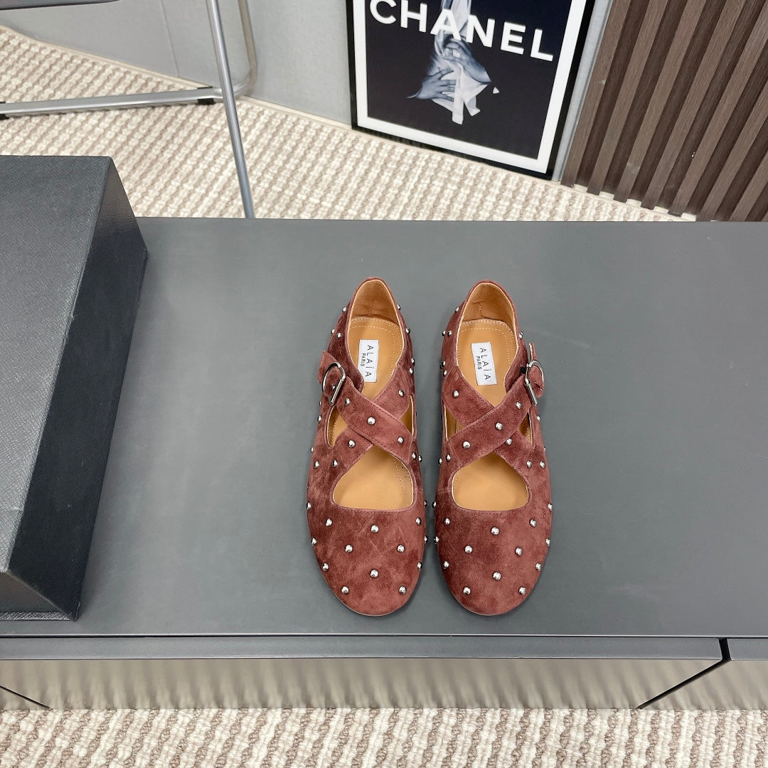 Alaia 2025 Criss Cross With Stud Ballet Flats Brown Suede 293213