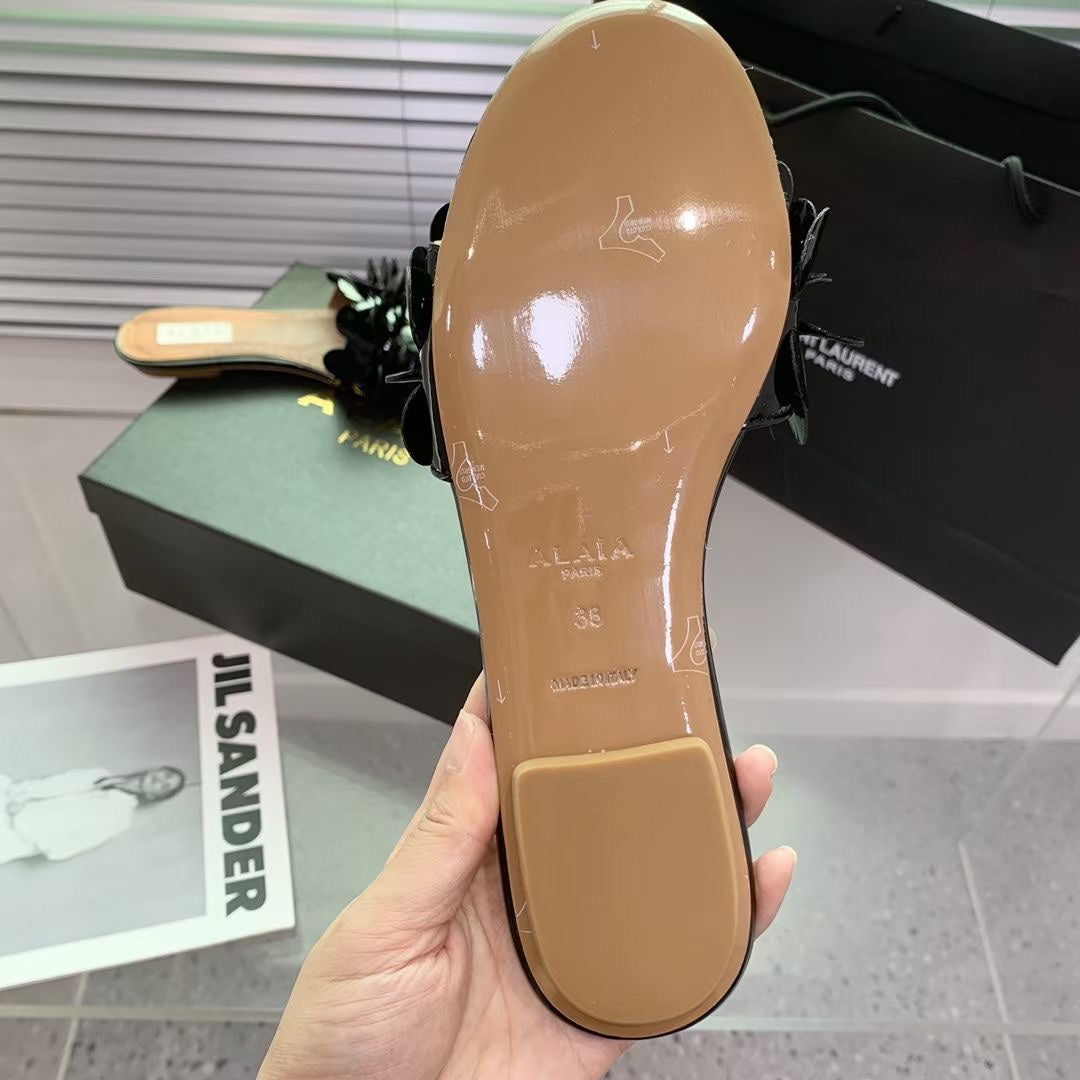 Alaia 25 Flower Slippers Glossy Black Sheepskin 293160