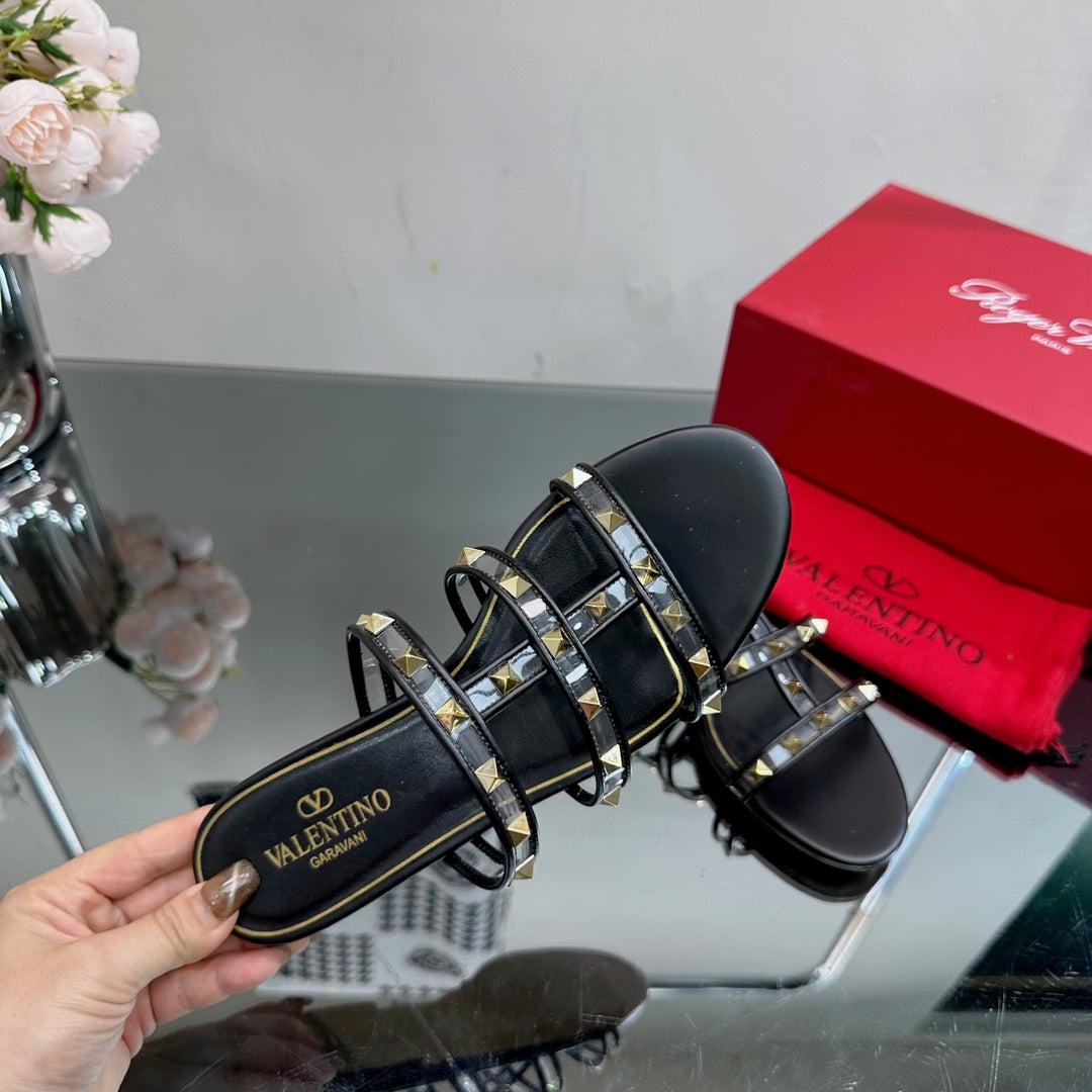 VT 25 Rockstud Flat Sandals Black PVC Sheepskin