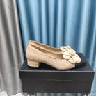 CC MEDIUM HEELS IN TAN BEIGE SUEDE AND BLACK CALFSKIN WITH FLOWER