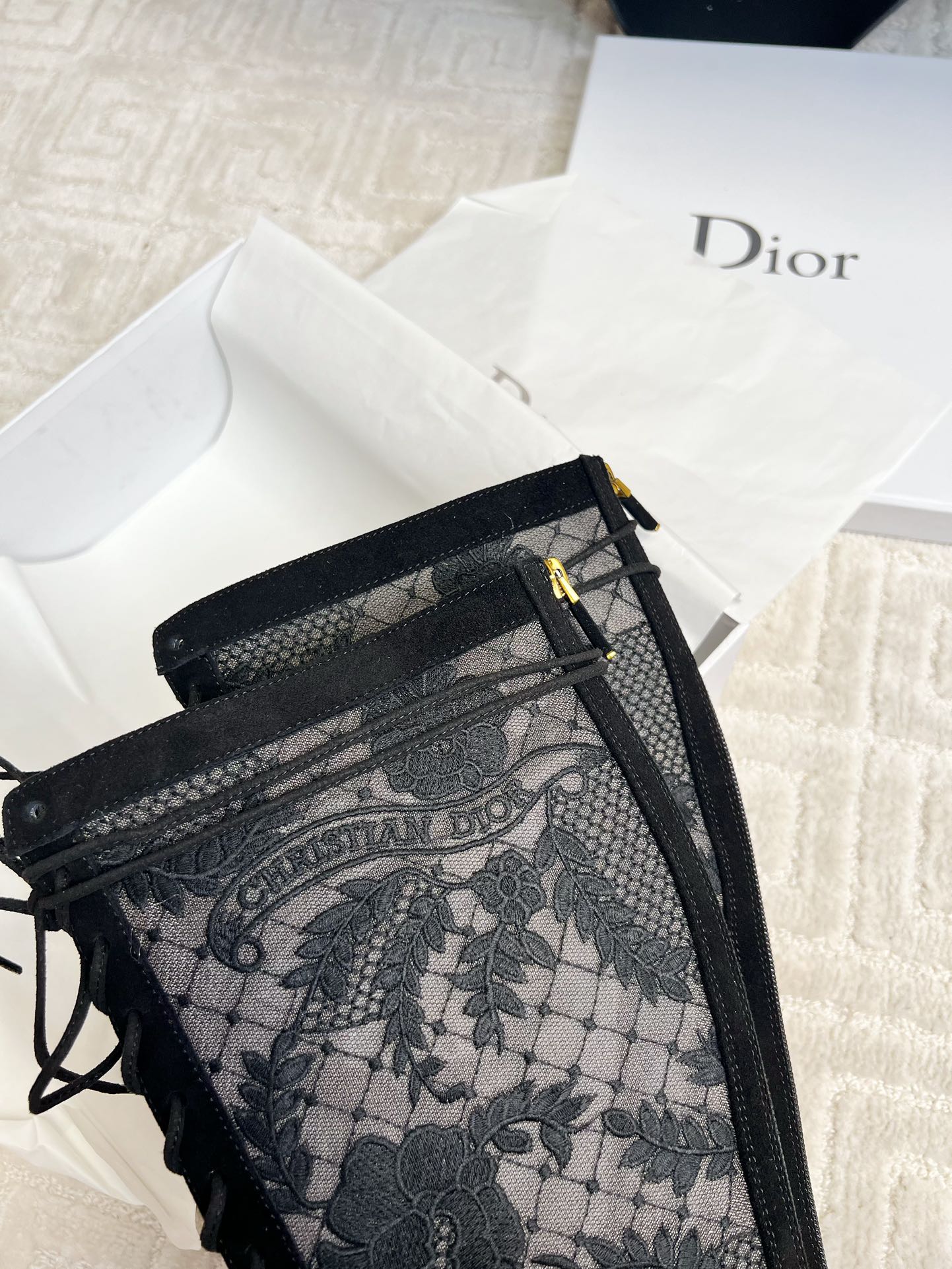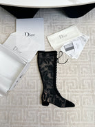 CD Naughtily-D Heeled High Boots Black Transparent Mesh Roses Embroidery And Suede