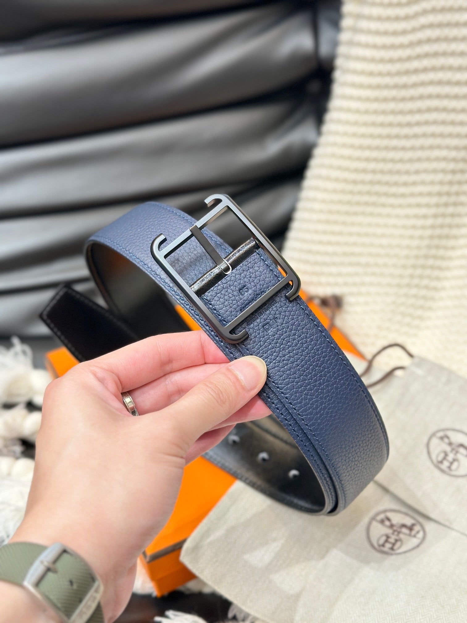 HM HADRIEN 38MM REVERSIBLE BELT NAVY BLUE AND BLACK LEATHER BLACK BUCKLE