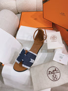 - Material: Sandal in Clafskin, Denim with straight cut edges, "H" cut-out detail and thin ankle strap.
