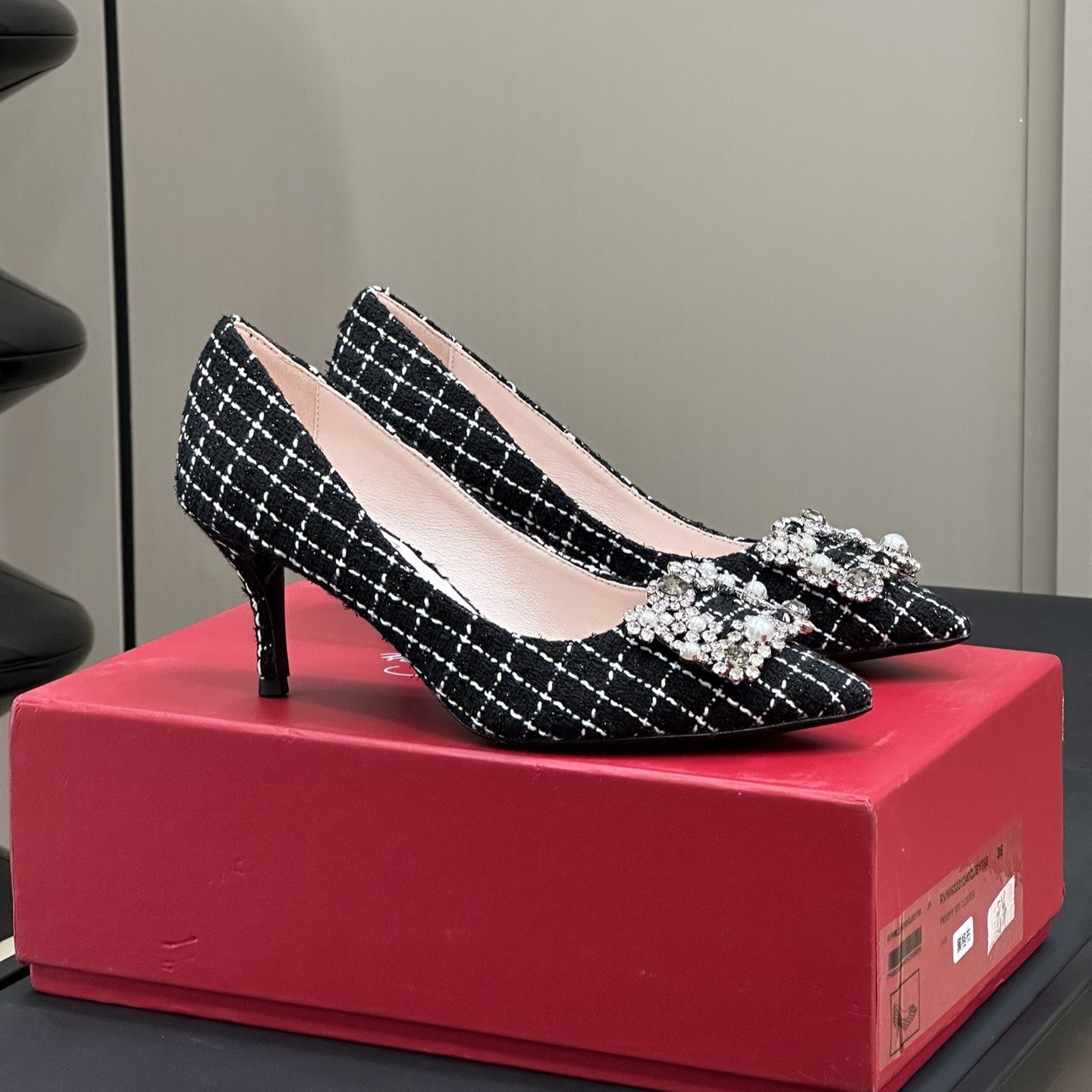 Flower Strass Buckle Pump 85 Black White Fabric