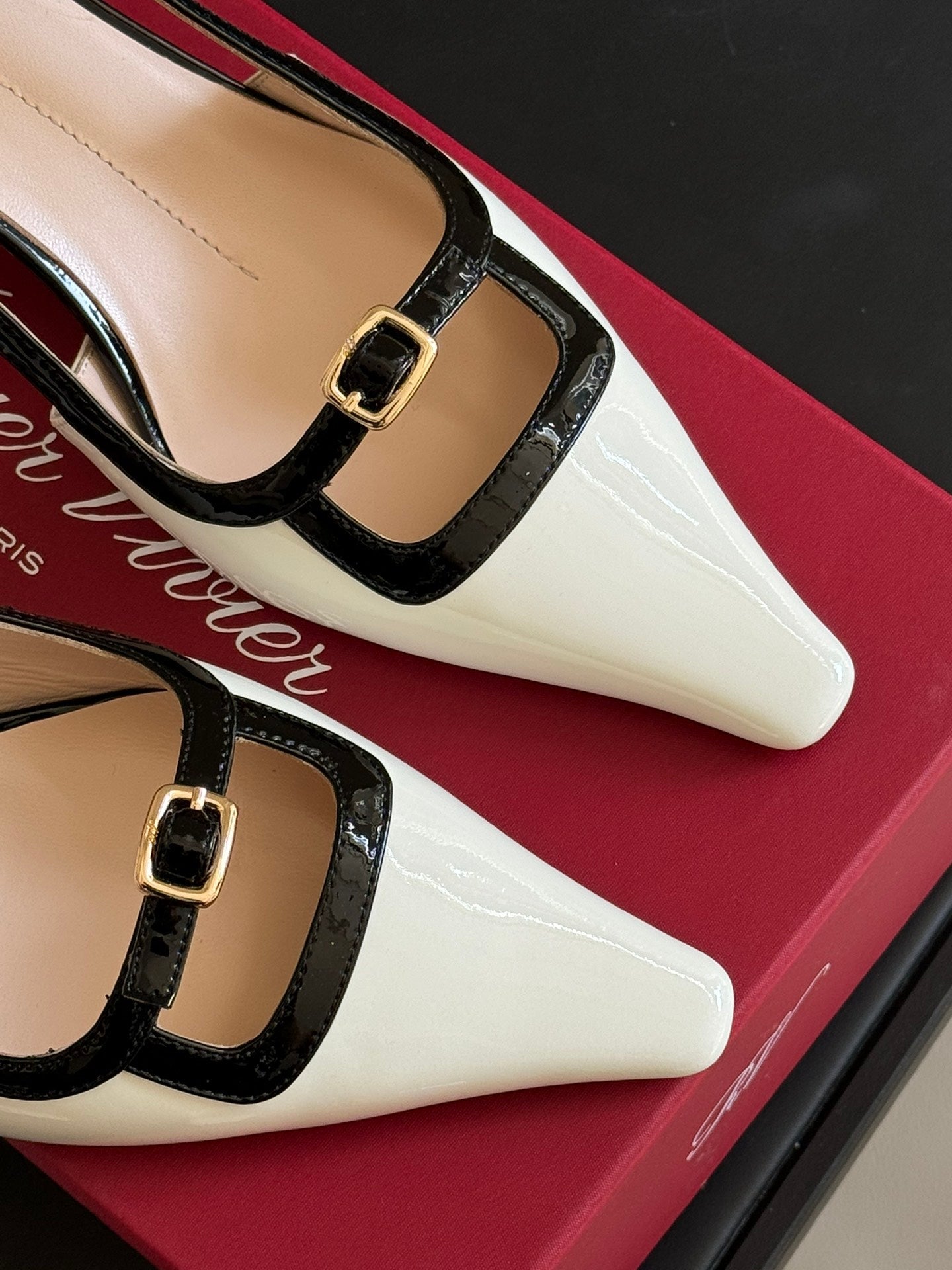 Viv Canard Slingback Pumps 55 in Patent White Black Leather