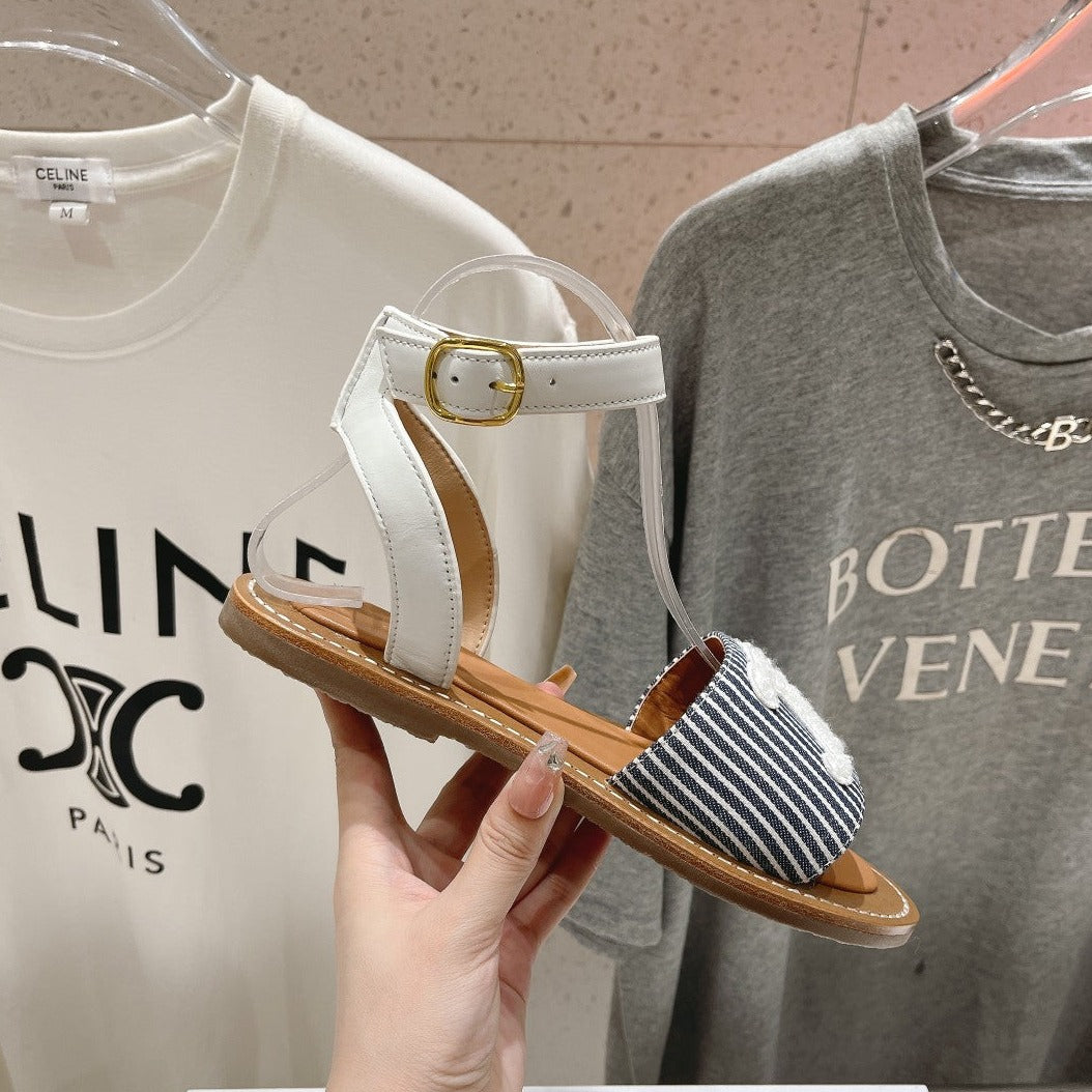 LYMPIA SANDAL IN TRIOMPHE MACCRAMÉ COTTON & CALFSKIN OFF WHITE / NAVY