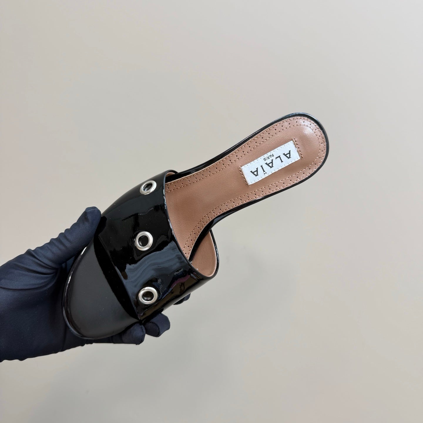 Alaia 2025 Oeillets Embellished Leather Sandals Glossy Black Lambskin 299668