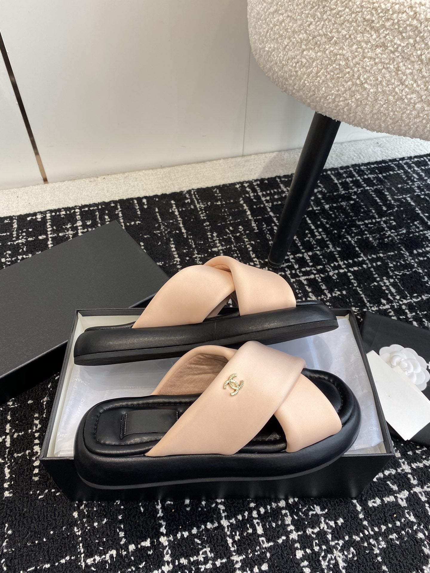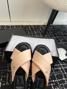 cross puffy slippers beige black lycra fabric