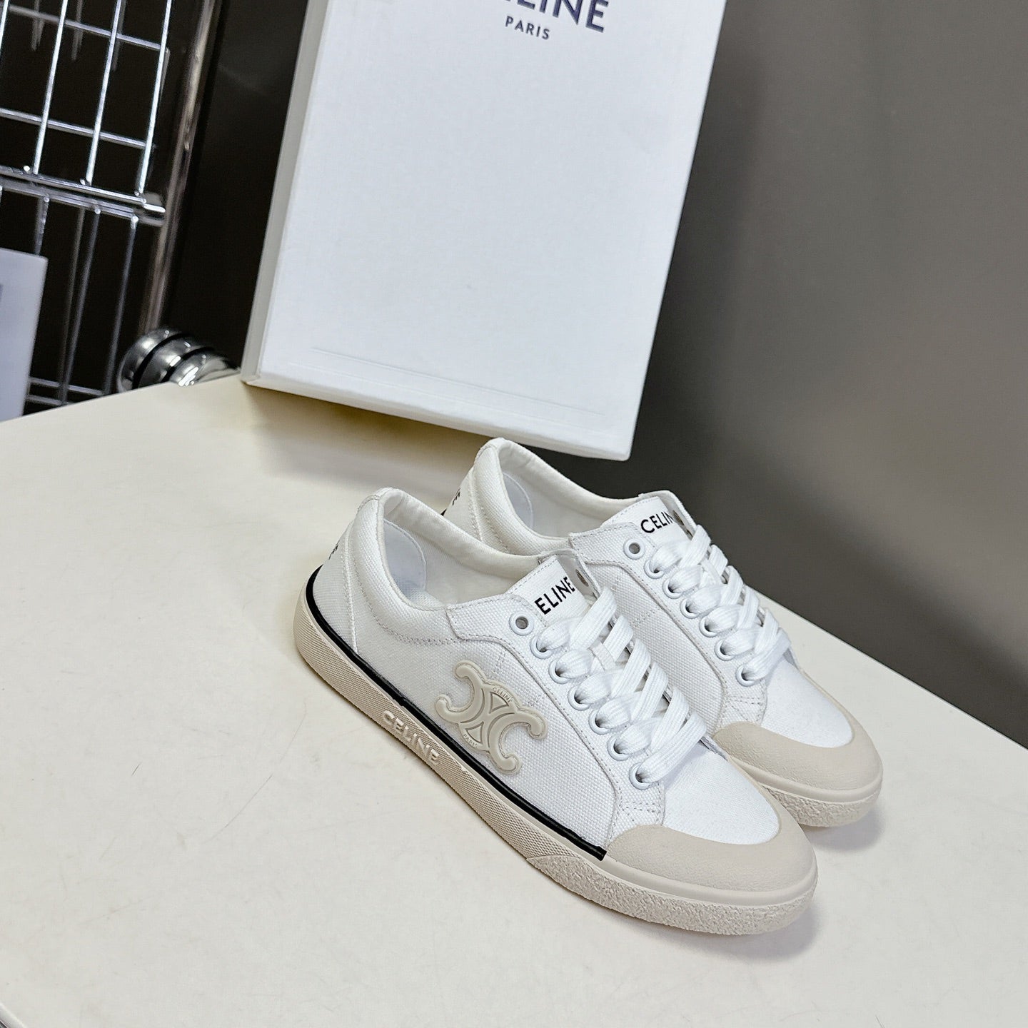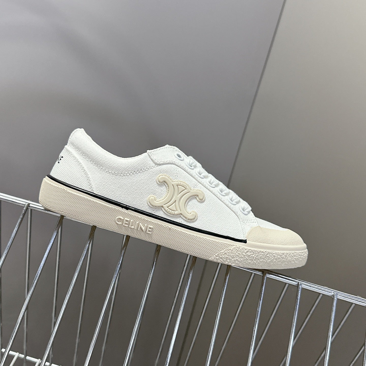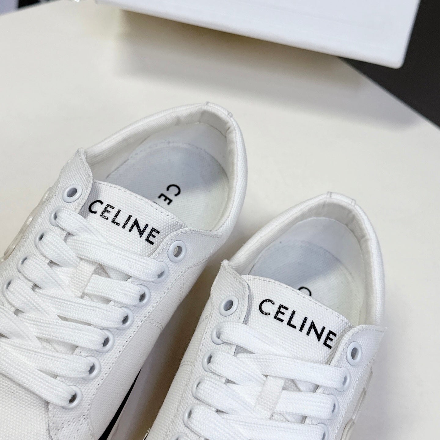 JANE SNEAKERS LOW LACE-UP WITH TRIOMPHE PATCH IN CANVAS AND CALFSKIN DETAIL DENIM/ WHITE LOGO