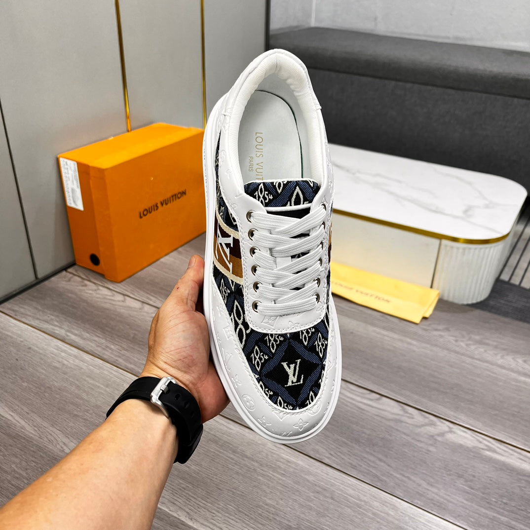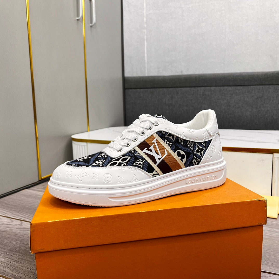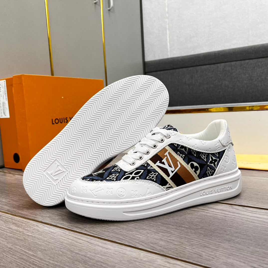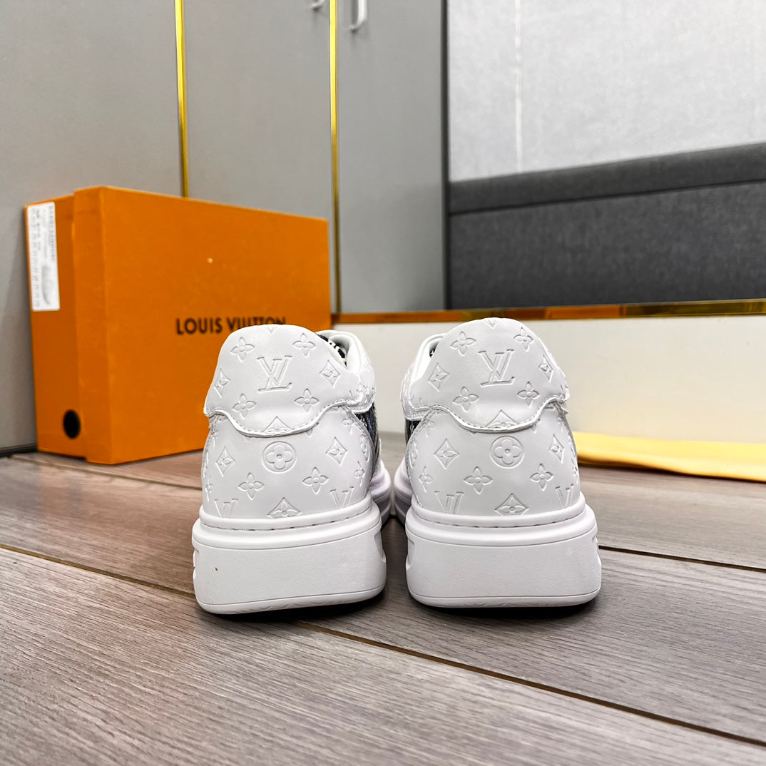 LV TRAINER IN WHITE EMBOSSED CALFSKIN AND MONOGRAM FABRIC