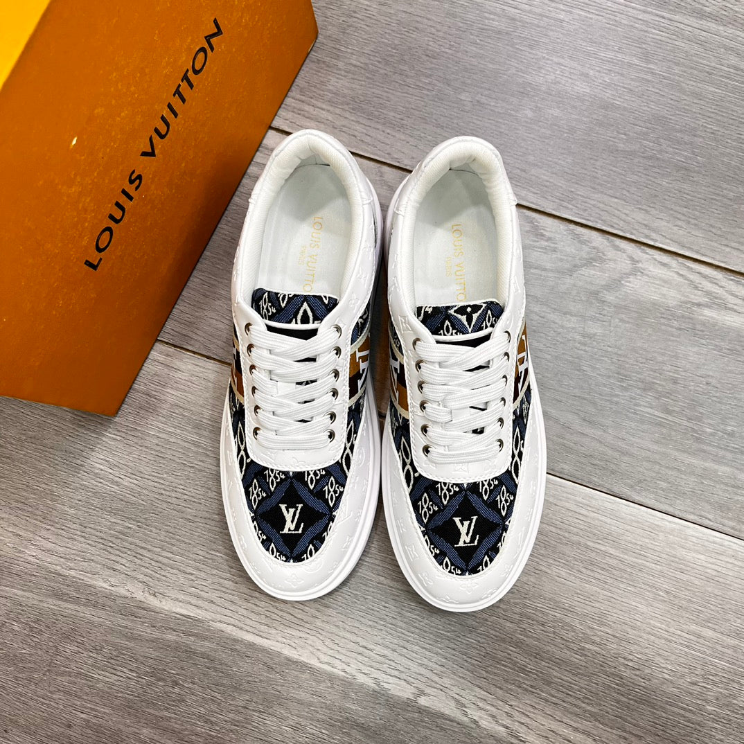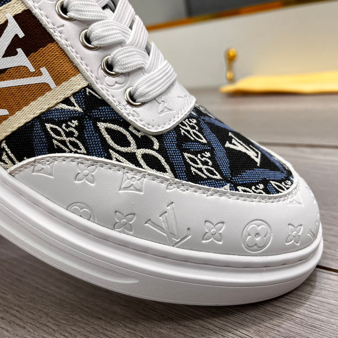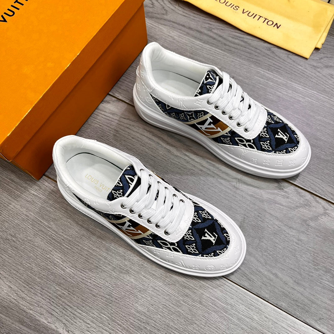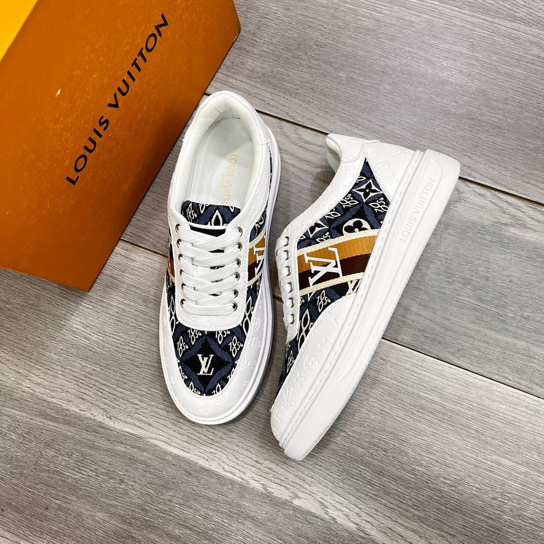 LV TRAINER IN WHITE EMBOSSED CALFSKIN AND MONOGRAM FABRIC